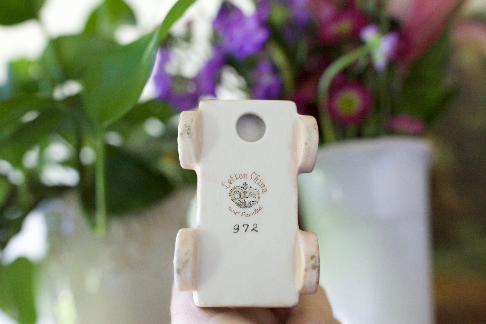 This adorable statue is a vintage Lefton Child wearing a newspaper hat is riding a hobby horse. The figurine is antique but in very good condition including none of the fingers have been broken or chipped. This Lefton China #972 Figurine is marked Hand Painted on the bottom and stamped Lefton. The little kid is adorable dressed in green and has a cute hat on while riding a toy pony!