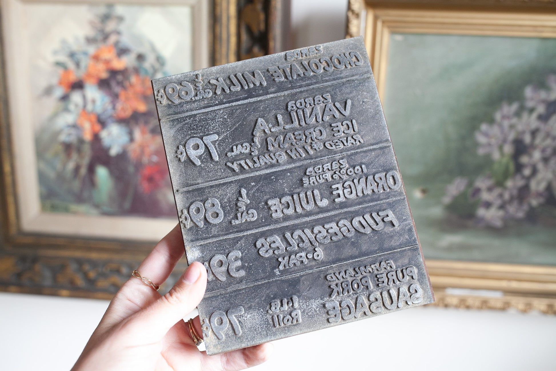 This is a Zarda Dairy Store Menu Stamp/letterpress. The Zarda family created one of the largest dairies in Kansas. Founded by Frank Zarda and his brothers not long after their arrival. Since 1913 and was said to have closed and sold the business in 1987. The prices are great... orange juice, ice cream, fudgesicles and more on the menu! I could imagine this being a fun decoration for a kitchen! Size is 7.5"x 6" x 1".