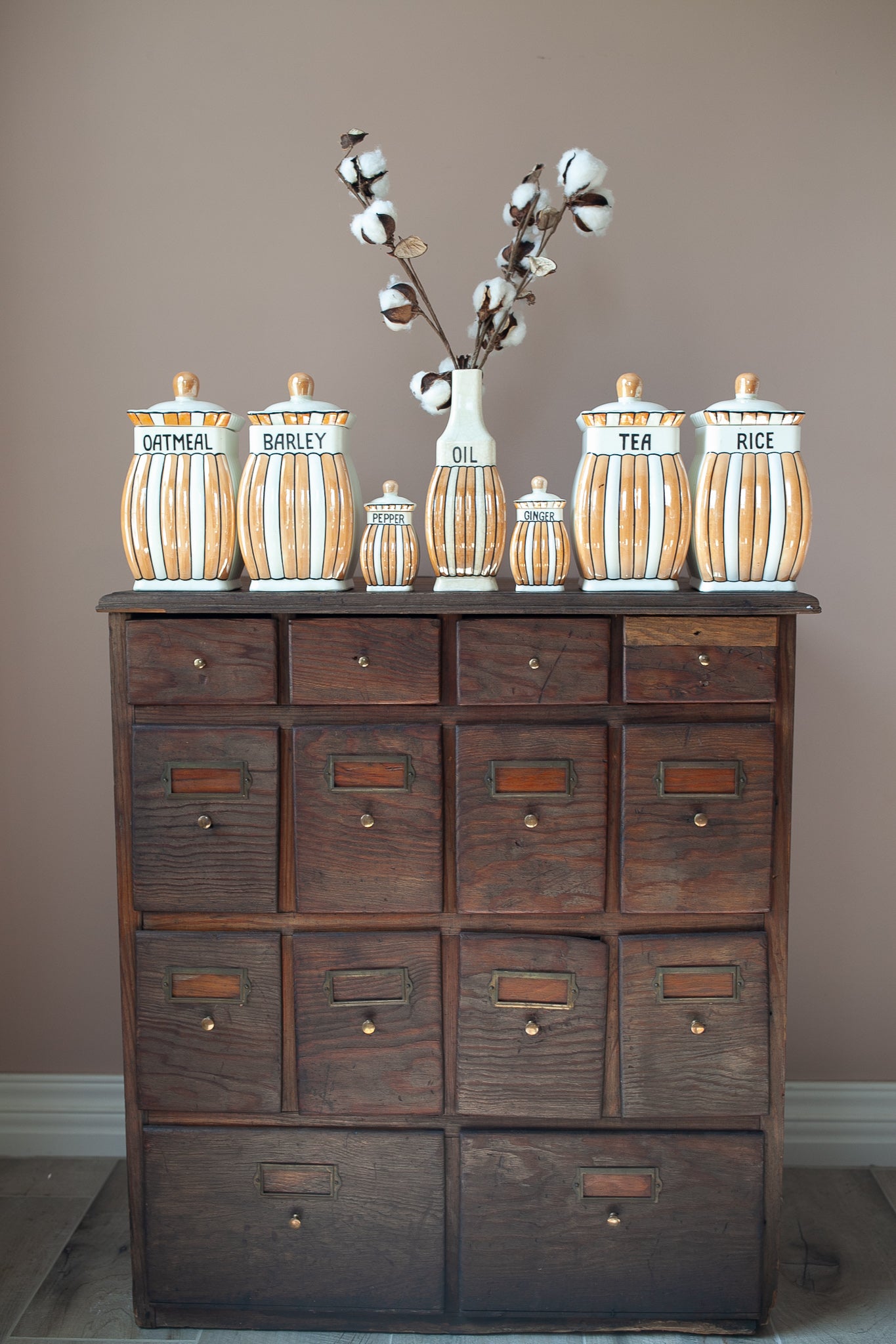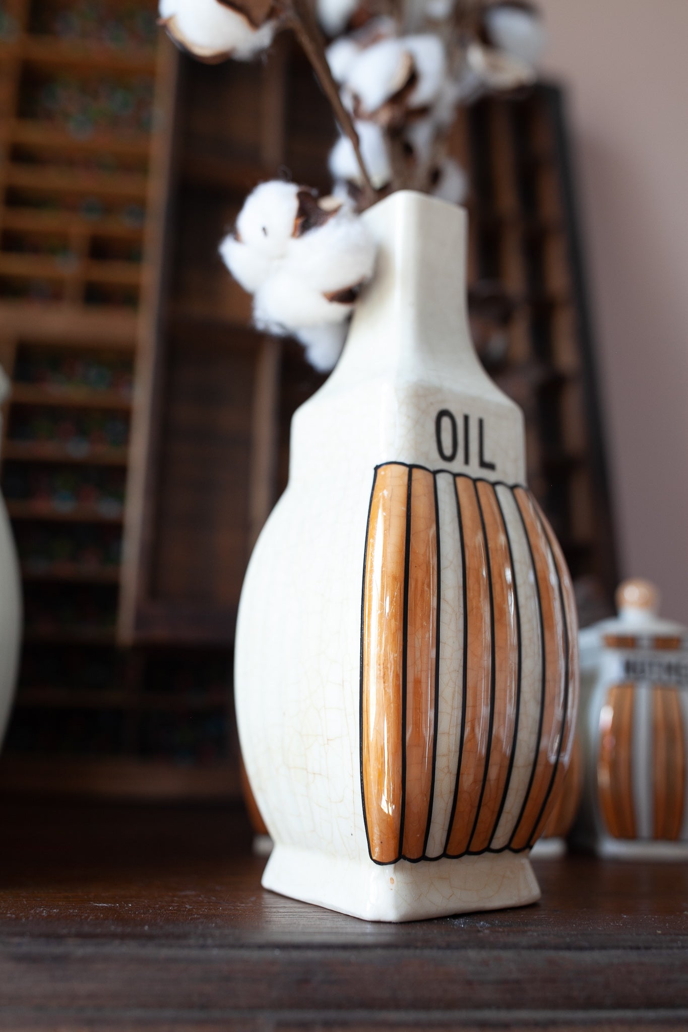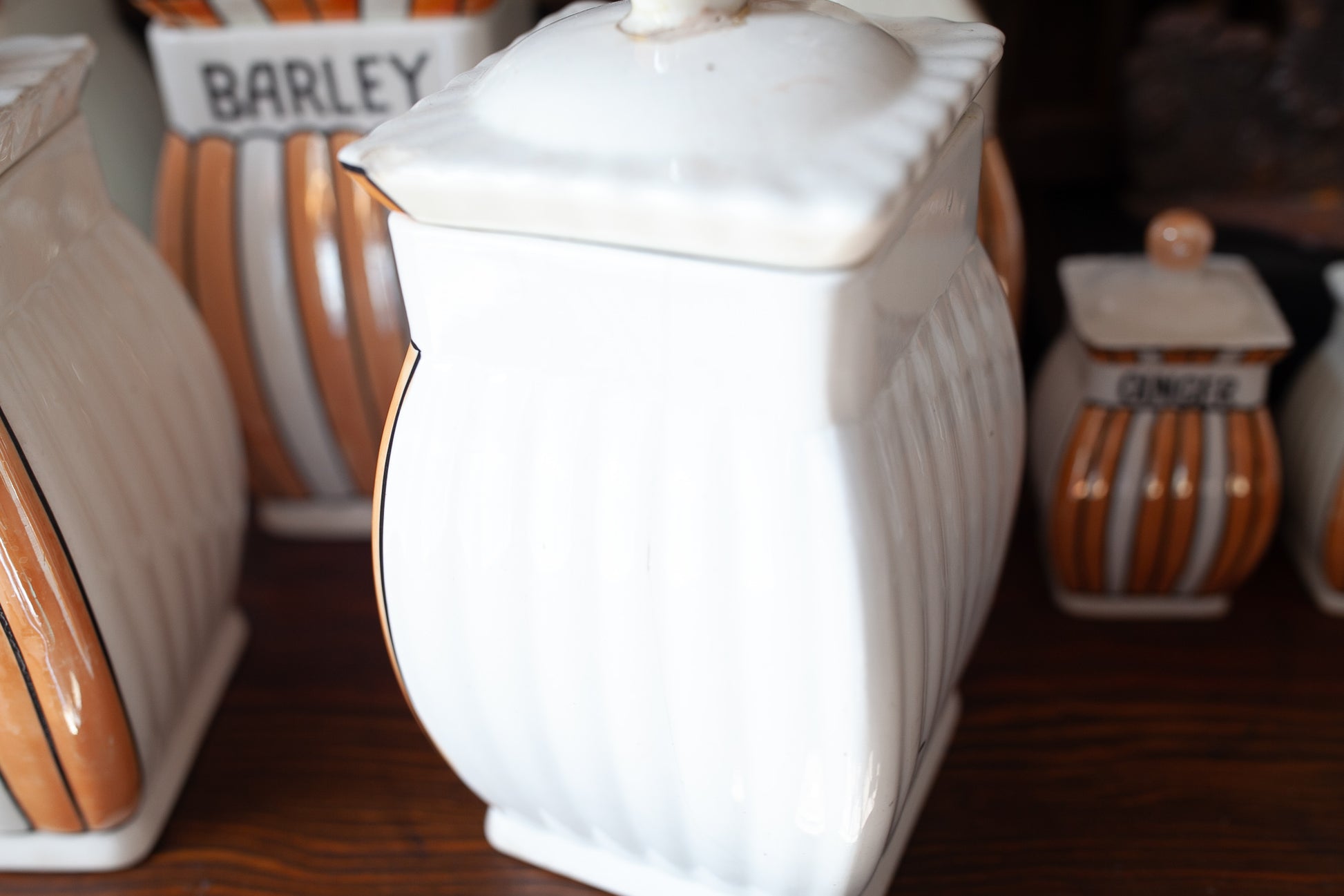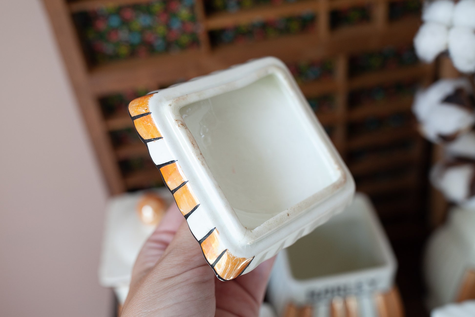 This is a really beautiful lusterware set made in Germany! It is a gorgeous orange, off white, and black set. There are 4 large canisters and 3 small canisters, and an oil holder. They all have their lids still and each has some wear to it. Overall they are all clean and sturdy and can be used or displayed! There are some fracture lines and crazing but the Tea canister does have a chip on the corner on the back. The rice lid has a broken knob that has been repaired- see photo. All the lids are interchangeable between the same size. This set includes Oatmeal, Barley, Tea, and Rice in the large size. Nutmeg, ginger, and pepper for the small size. The large canisters are about 6.5" tall without the lid and about 3.5x3.5" opening- widest point about 4.5". The small canisters are about 3.25" tall without the lid and are about 2.25" wide at the widest point and have about a 1.5" opening. These are being sold as a set first and if there is enough interest in selling individually I can separate them. The cost is including packaging/shipping.