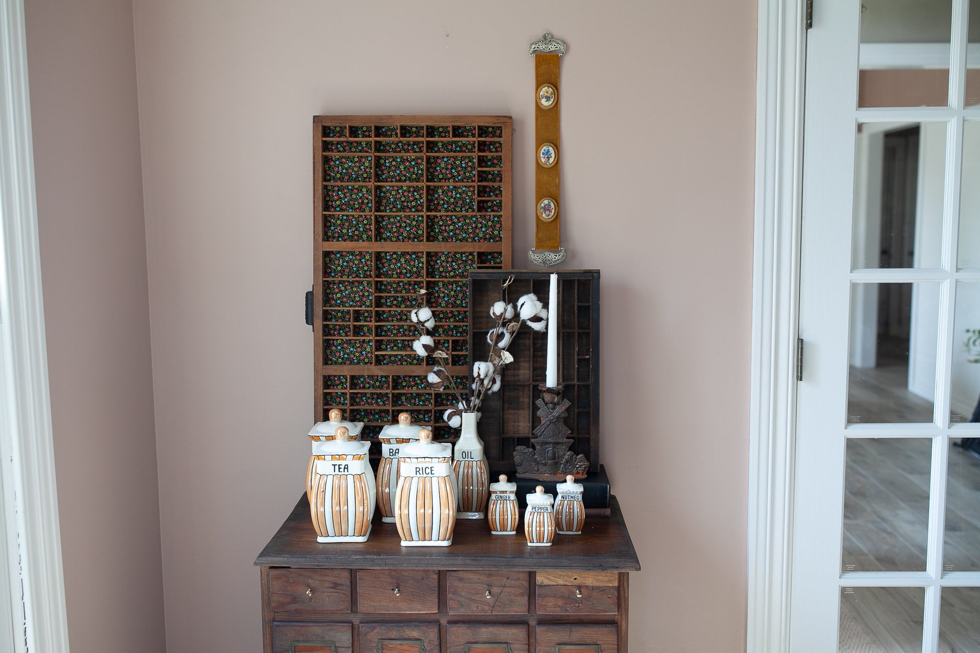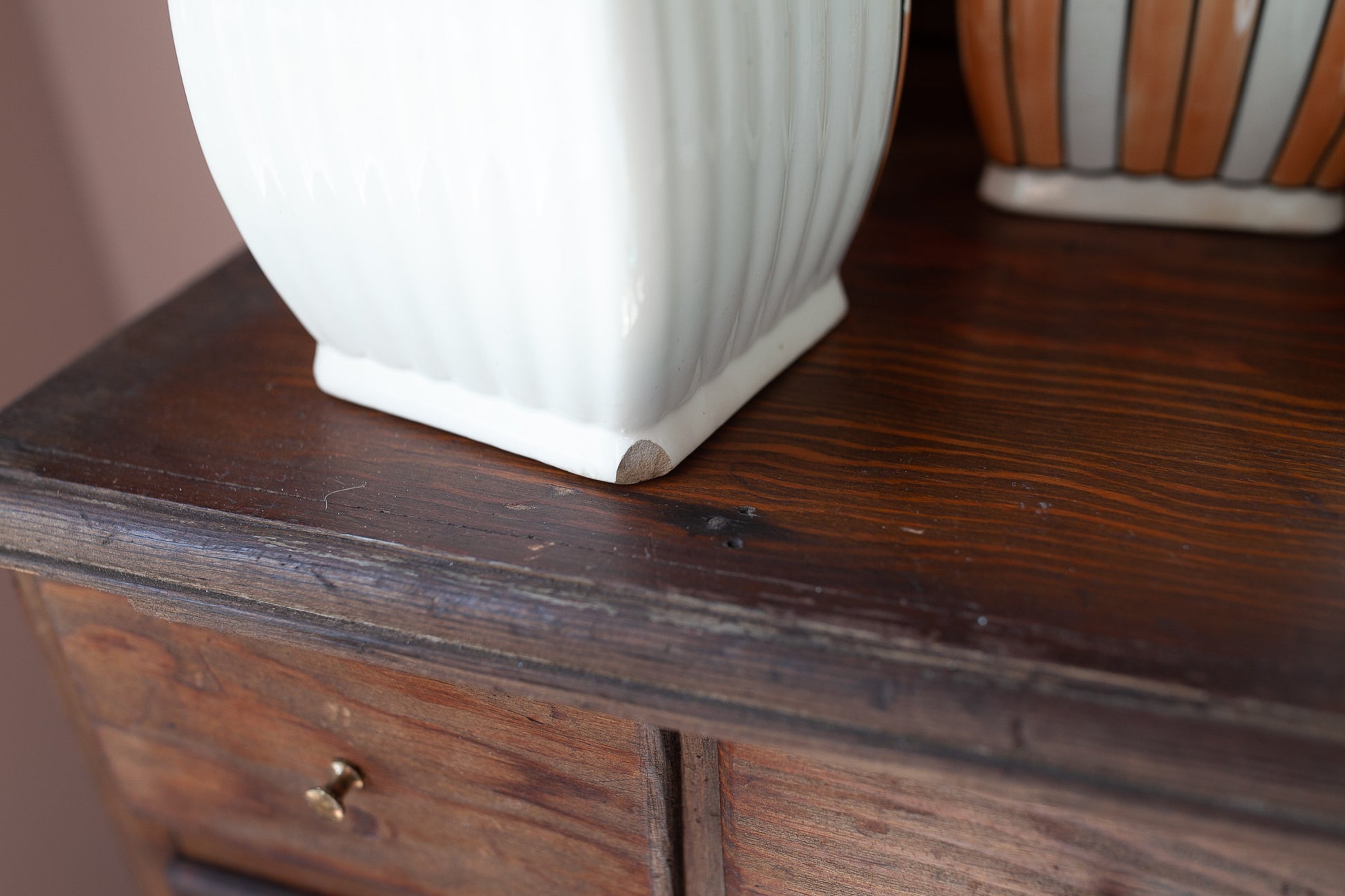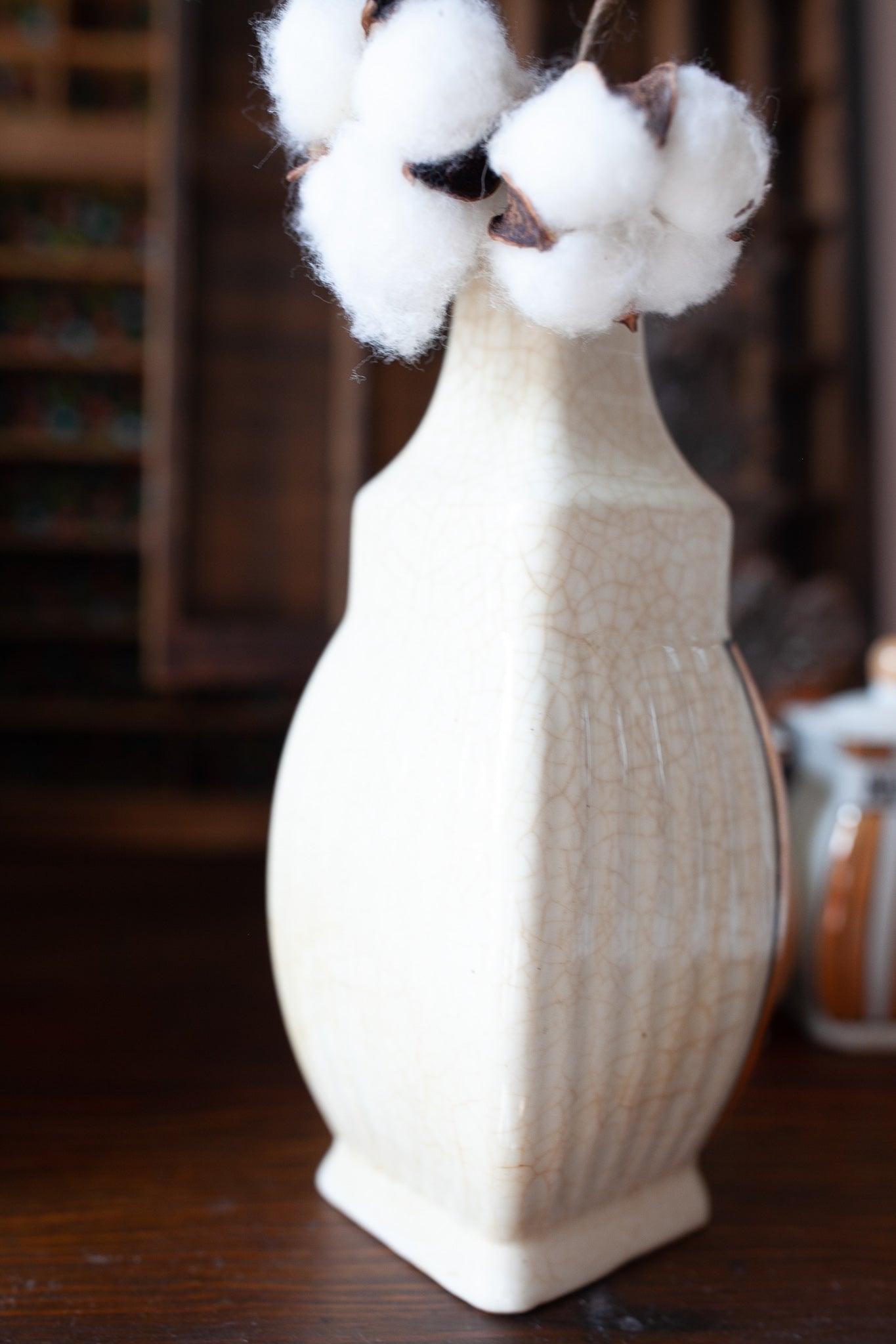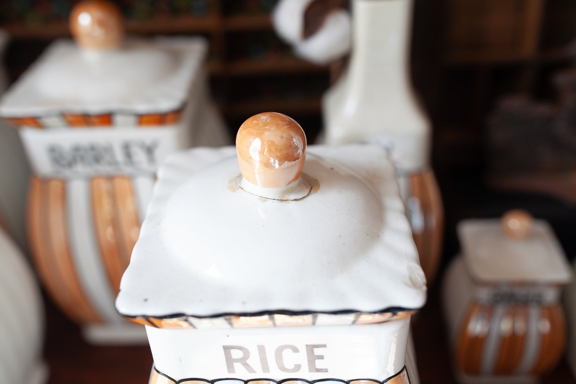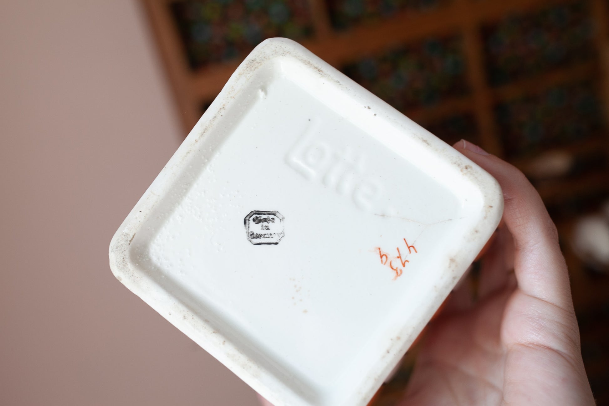 This is a really beautiful lusterware set made in Germany! It is a gorgeous orange, off white, and black set. There are 4 large canisters and 3 small canisters, and an oil holder. They all have their lids still and each has some wear to it. Overall they are all clean and sturdy and can be used or displayed! There are some fracture lines and crazing but the Tea canister does have a chip on the corner on the back. The rice lid has a broken knob that has been repaired- see photo. All the lids are interchangeable between the same size. This set includes Oatmeal, Barley, Tea, and Rice in the large size. Nutmeg, ginger, and pepper for the small size. The large canisters are about 6.5" tall without the lid and about 3.5x3.5" opening- widest point about 4.5". The small canisters are about 3.25" tall without the lid and are about 2.25" wide at the widest point and have about a 1.5" opening. These are being sold as a set first and if there is enough interest in selling individually I can separate them. The cost is including packaging/shipping.