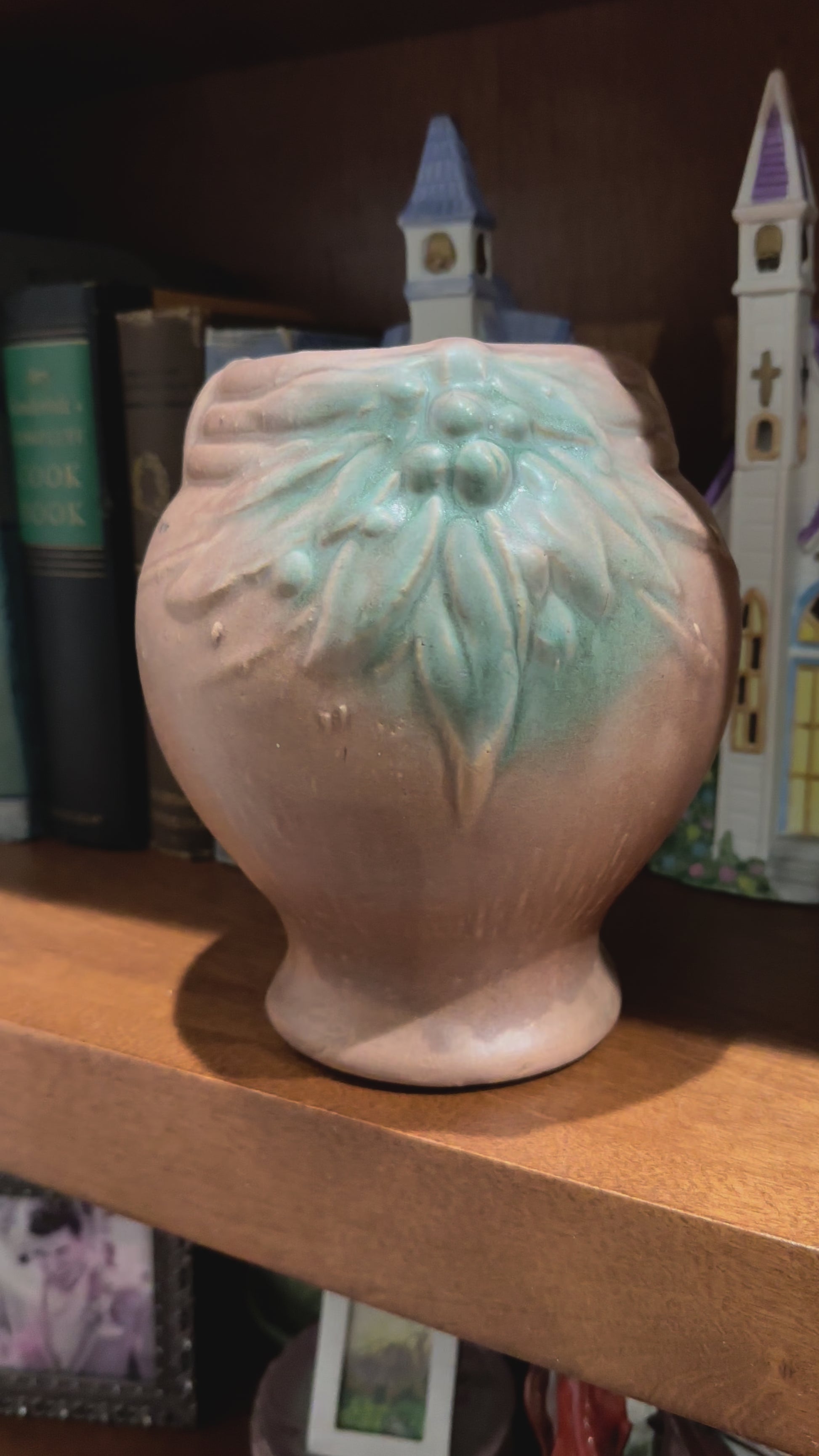 McCoy 1930s Vintage Pottery Leaves And Berries Matte Brown Ceramic Vase. Attractive form with good color and glaze. Excellent original condition. No chips, cracks, damage or repair of any kind. Typical factory flaws. Vase is 7" tall and 6 1/4" wide. Weighs about 3.5 lbs.