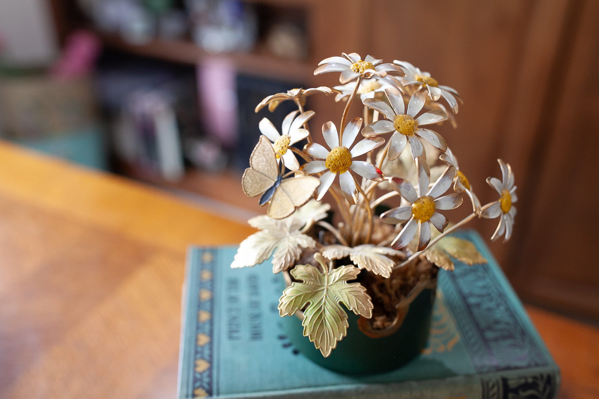 This is a gorgeous little arrangement of flowers made of metal. They are in a small green pot. The pot is green and has some gold detail painted on it. It has a few leaves and a butterfly. It looks to have had maybe more leaves or flowers at one time because some of the metal stems are short see photos. The arrangement looks great as is, but may have had more at one time. It is about 6.5" tall. One of the daisy centers is worn see photo. Daisies are popular flowers often associated with innocence and purity. They are commonly used in decorative arrangements and symbolize new beginnings and true love.