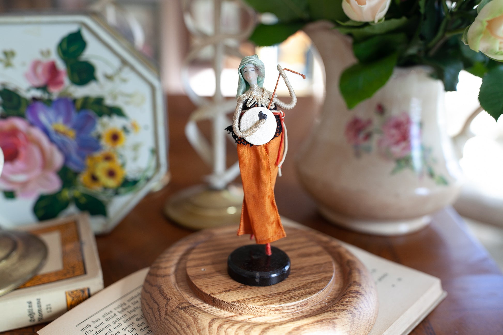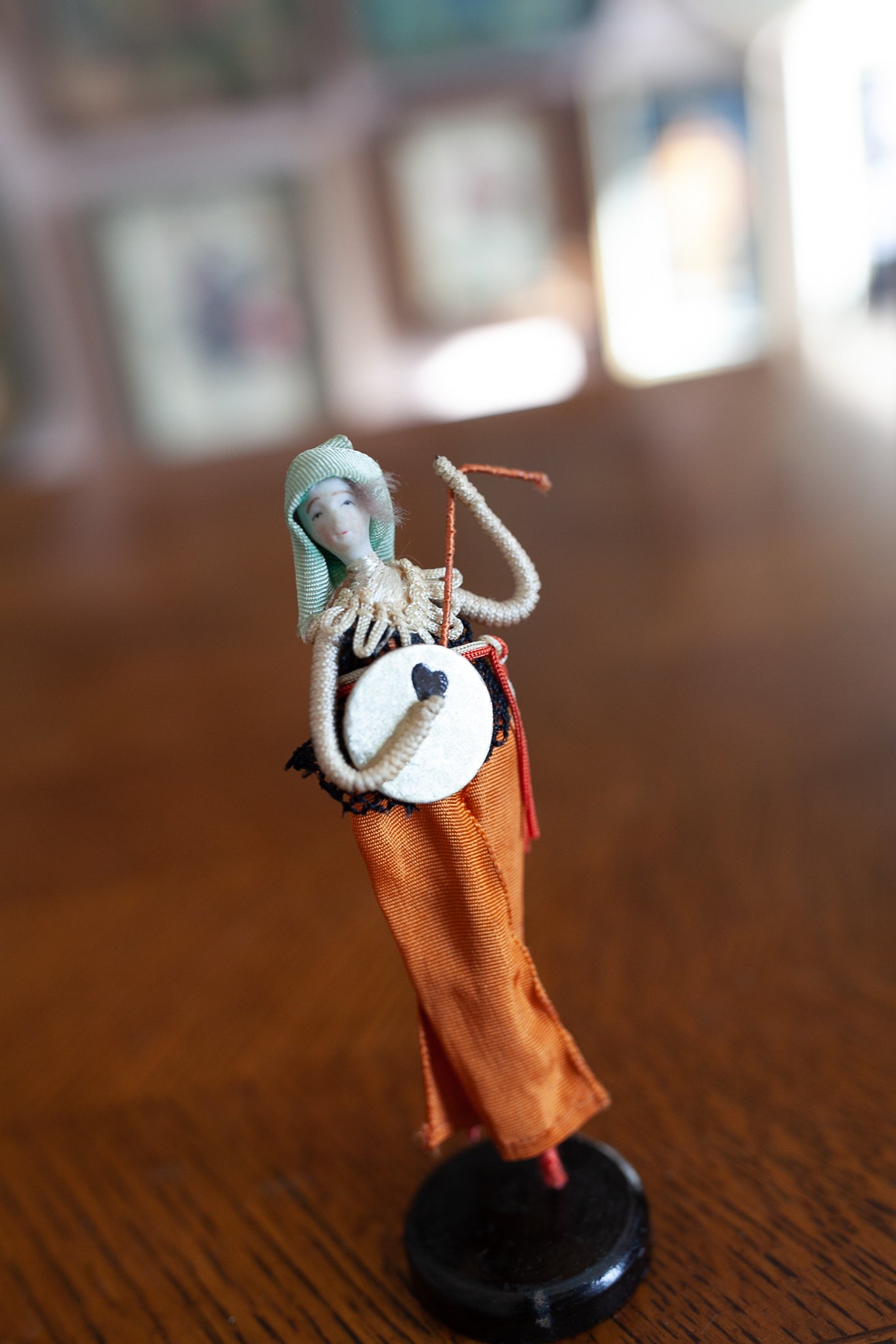 This little vintage doll is so unique! This doll has a tiny little bisque face with the tiniest details! She has a little wire body and tiny clothes. She is about 5" tall and stands on a base that is 1.5" diameter. I displayed her under a cloche, but the cloche is not included- doll only.