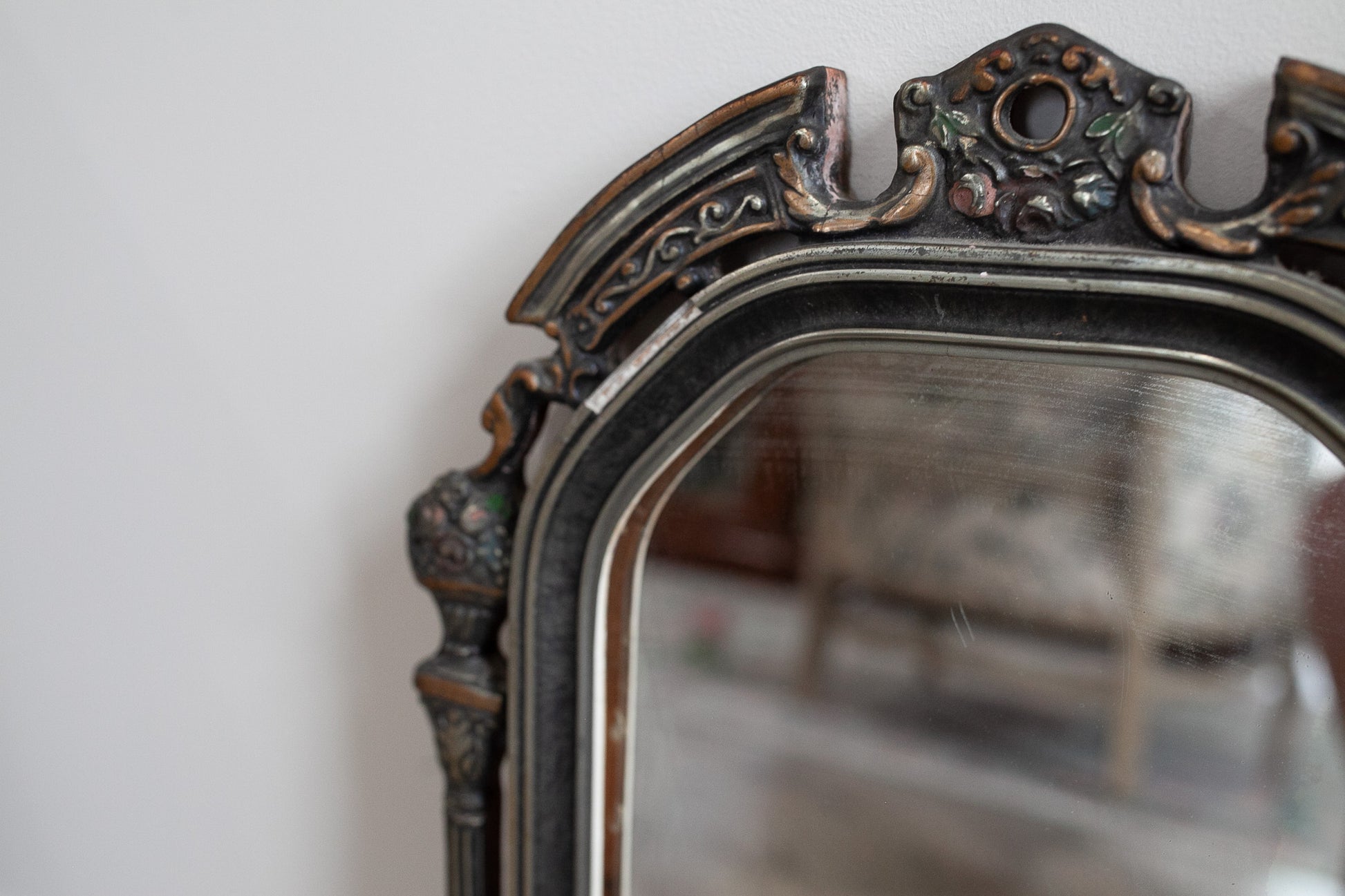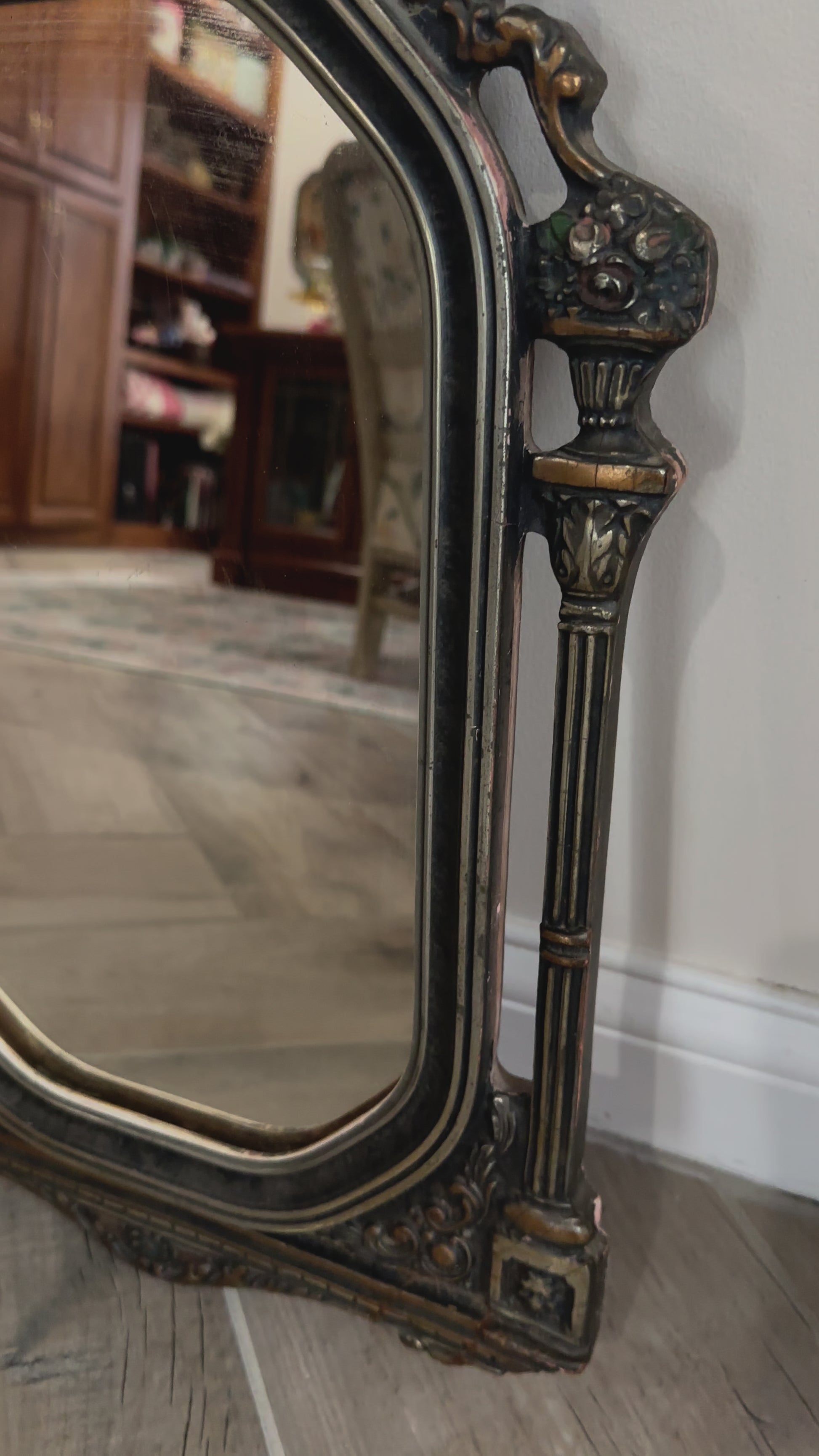 This mirror is so lovely. It is old and most likely antique in age. The details around the outside are so pretty. There are vases with flowers on the sides and gold and silver like painted details around the carved wood. The mirror glass is in good shape. The back is nailed in at the back. There is not any hanging hardware on the mirror, but it looks like there were two spots where someone drilled a hole to hang on a nail in the past. The bottom of the frame around the mirror has been repaired on both sides. 21"x14.5" in size. Some chipping at the wood edge around the mirror at the top left see photos.