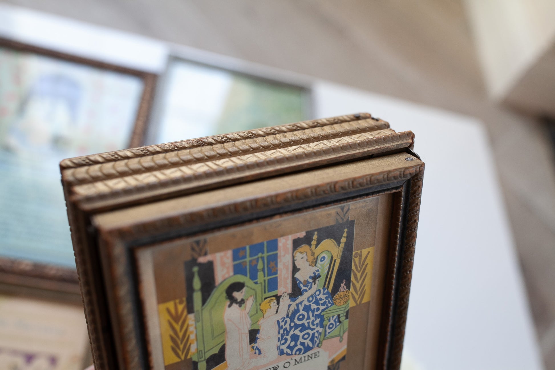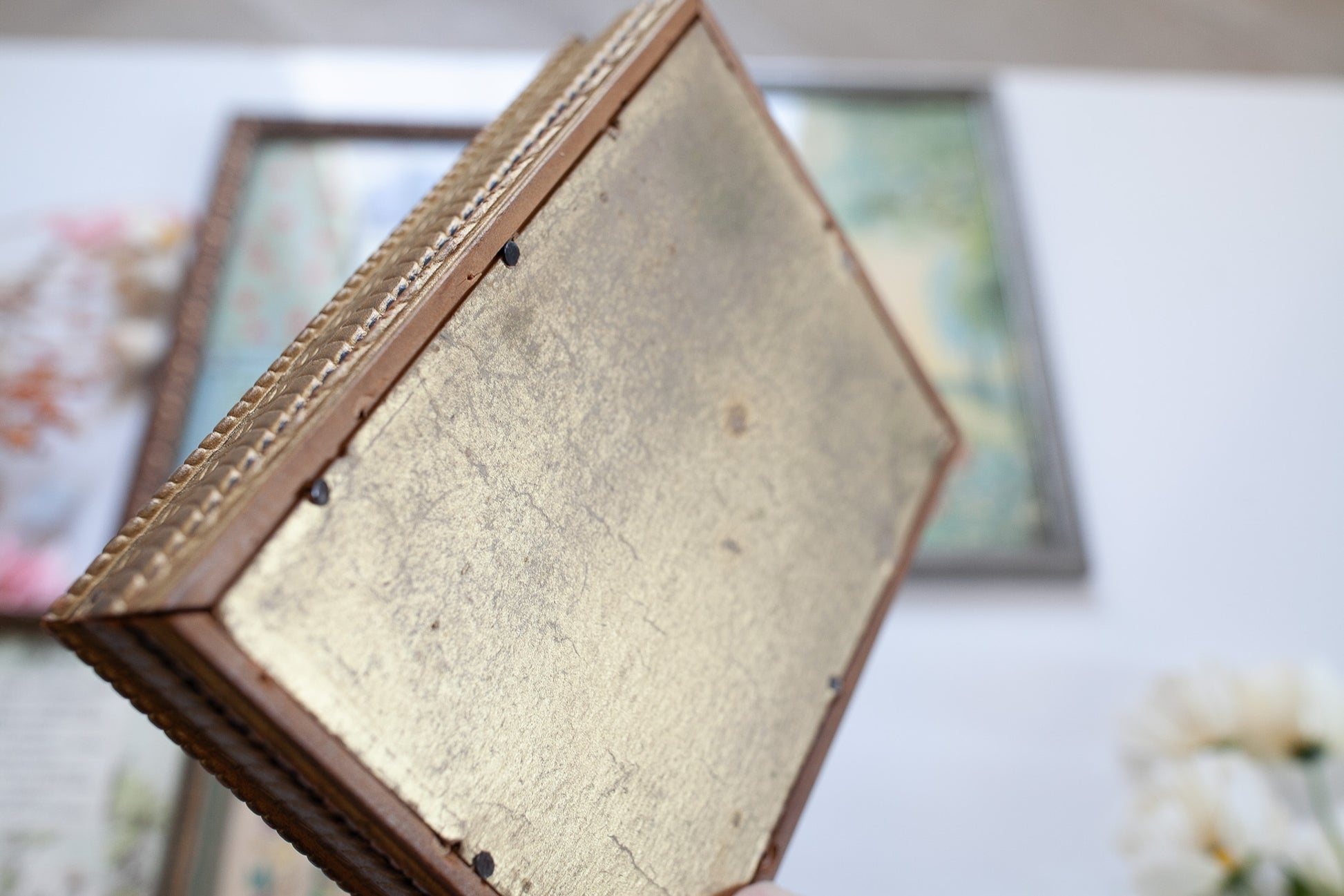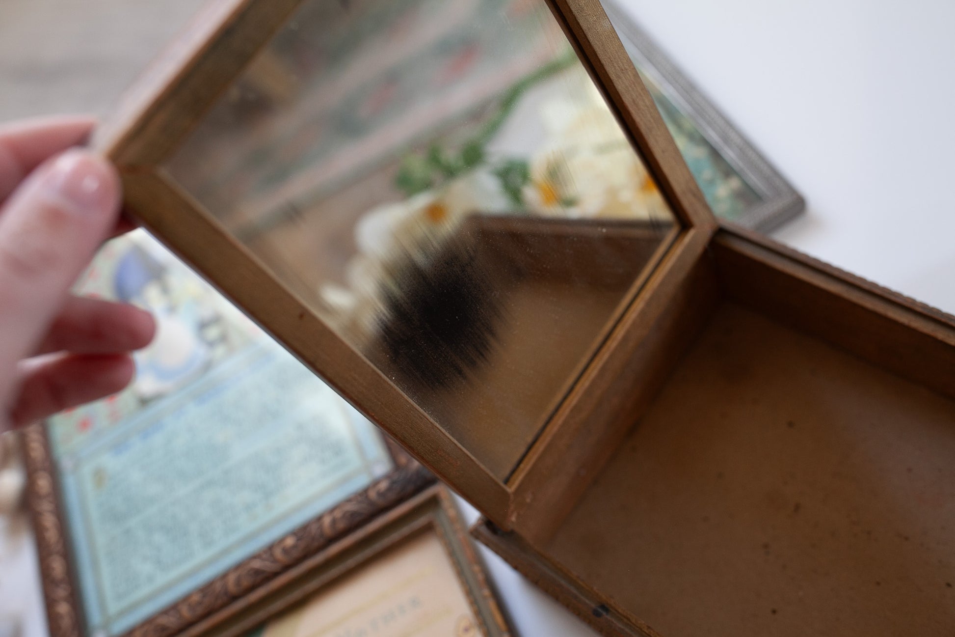 When you open the box there is a mirror on the lid. It has some black spots in the glass (see photos). The box edges are not super tight as they are old and joined by nails, but holds well! A beautiful piece!