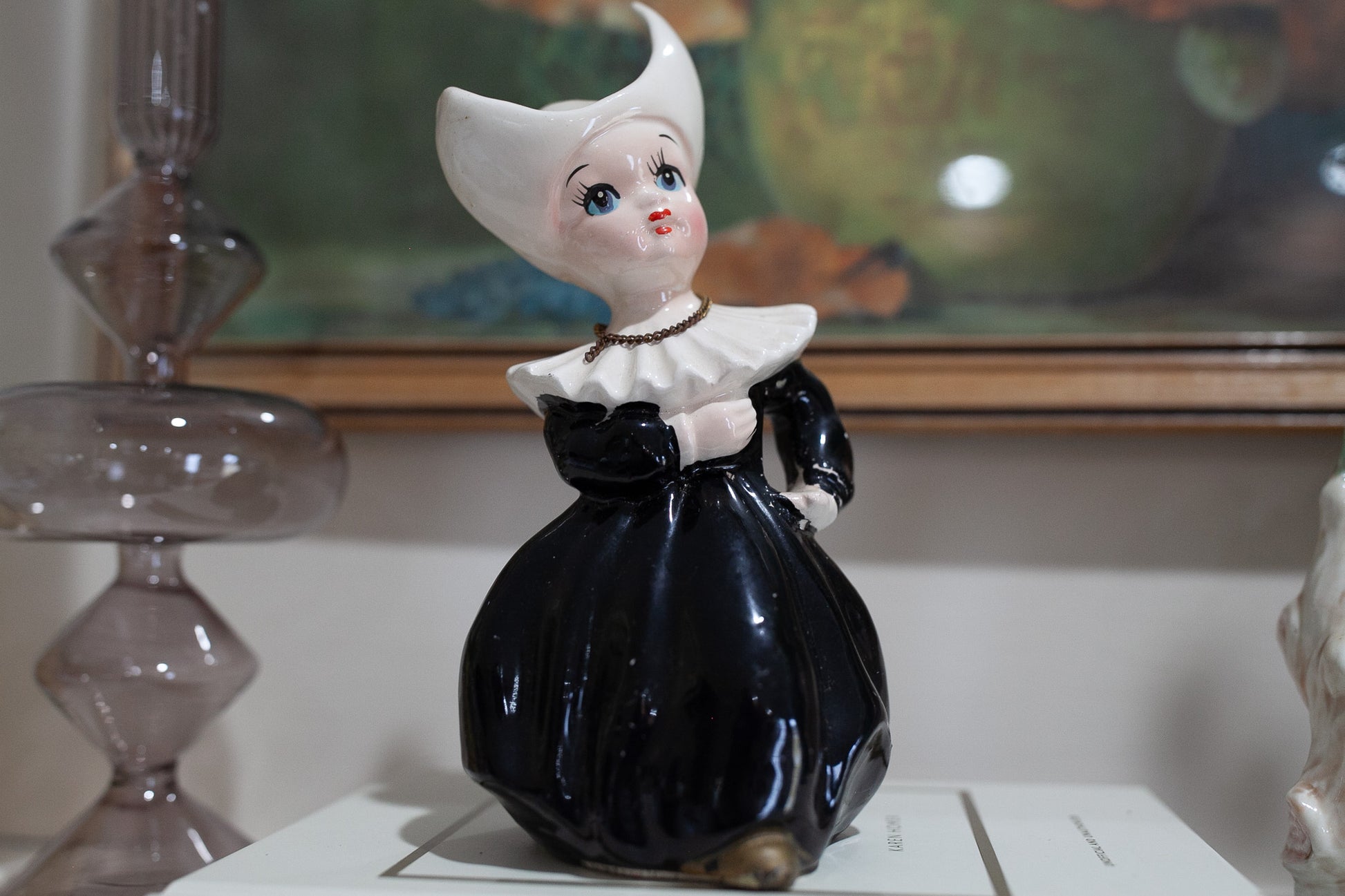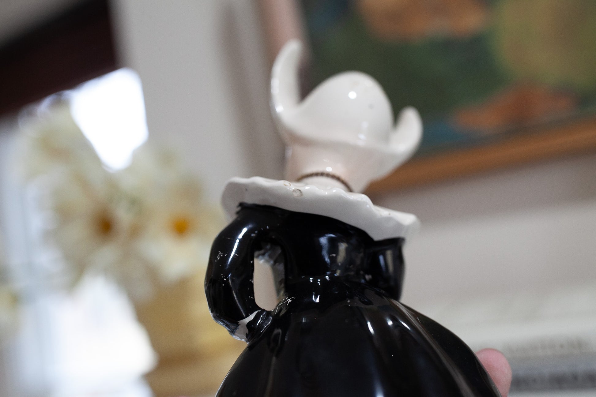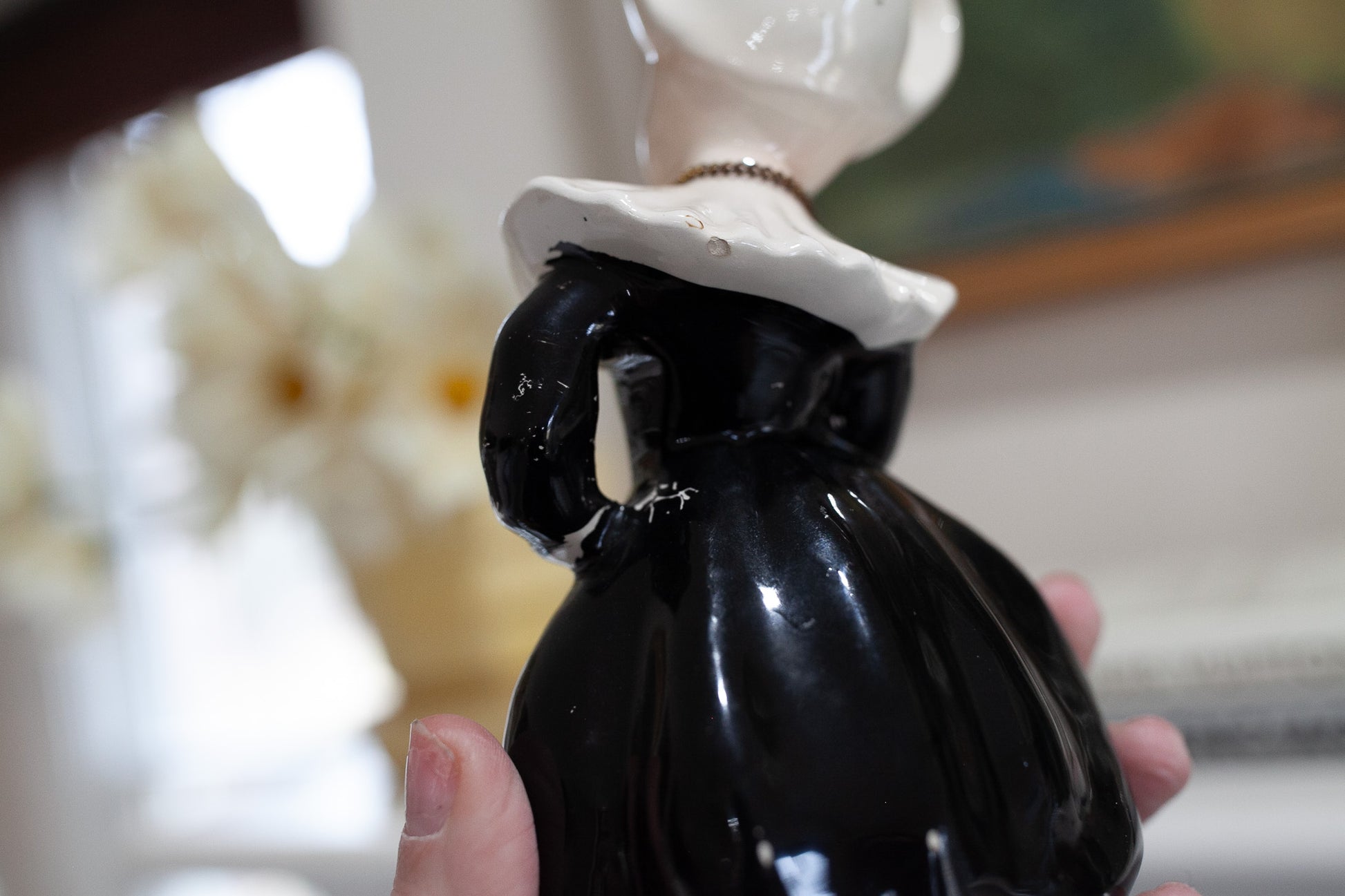 7.5" tall nun- she is in good vintage condition with some paint wear throughout. There is a chip in the collar on the back see all photos. She has a chain around her neck, but no cross on the chain.