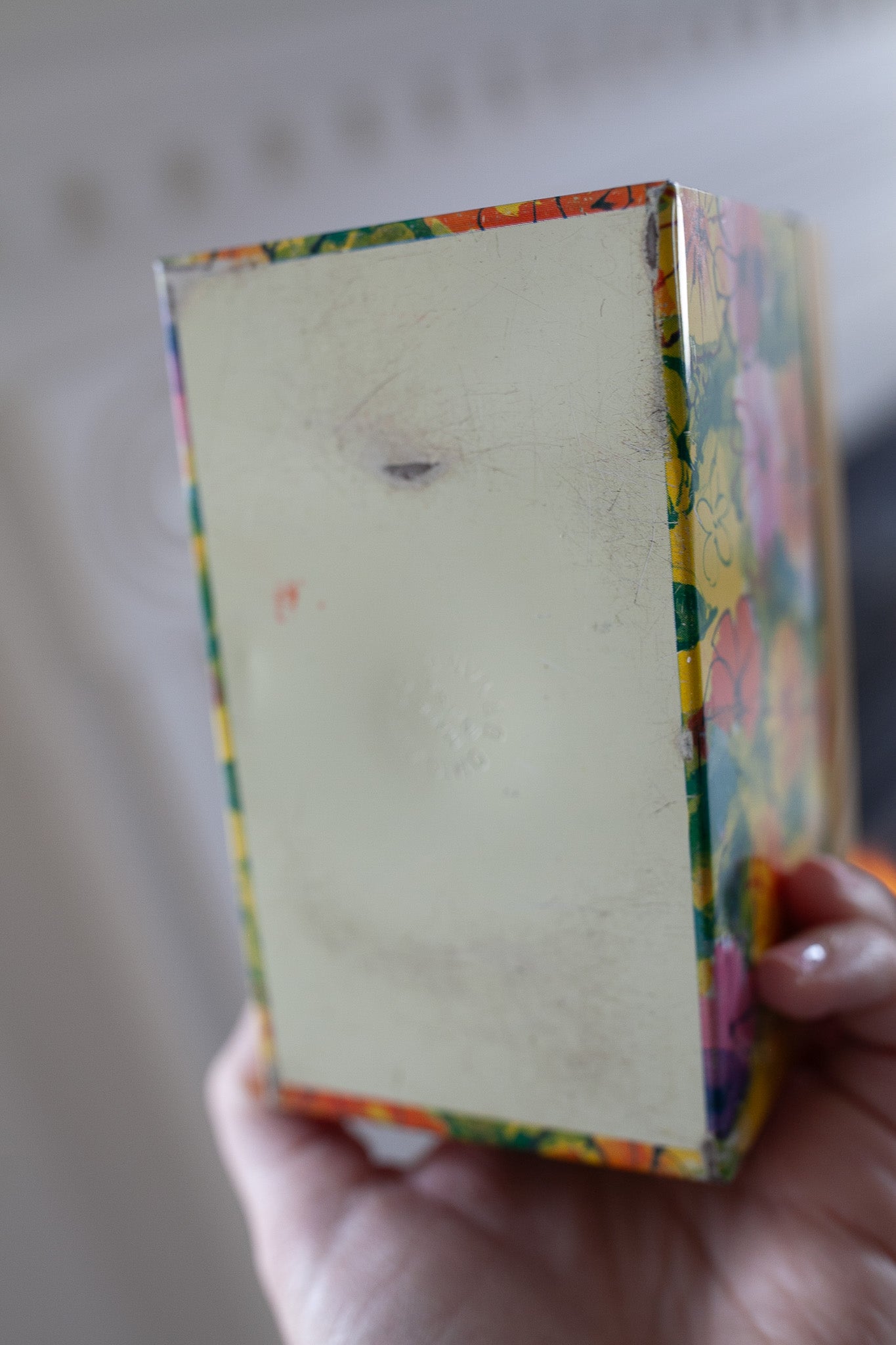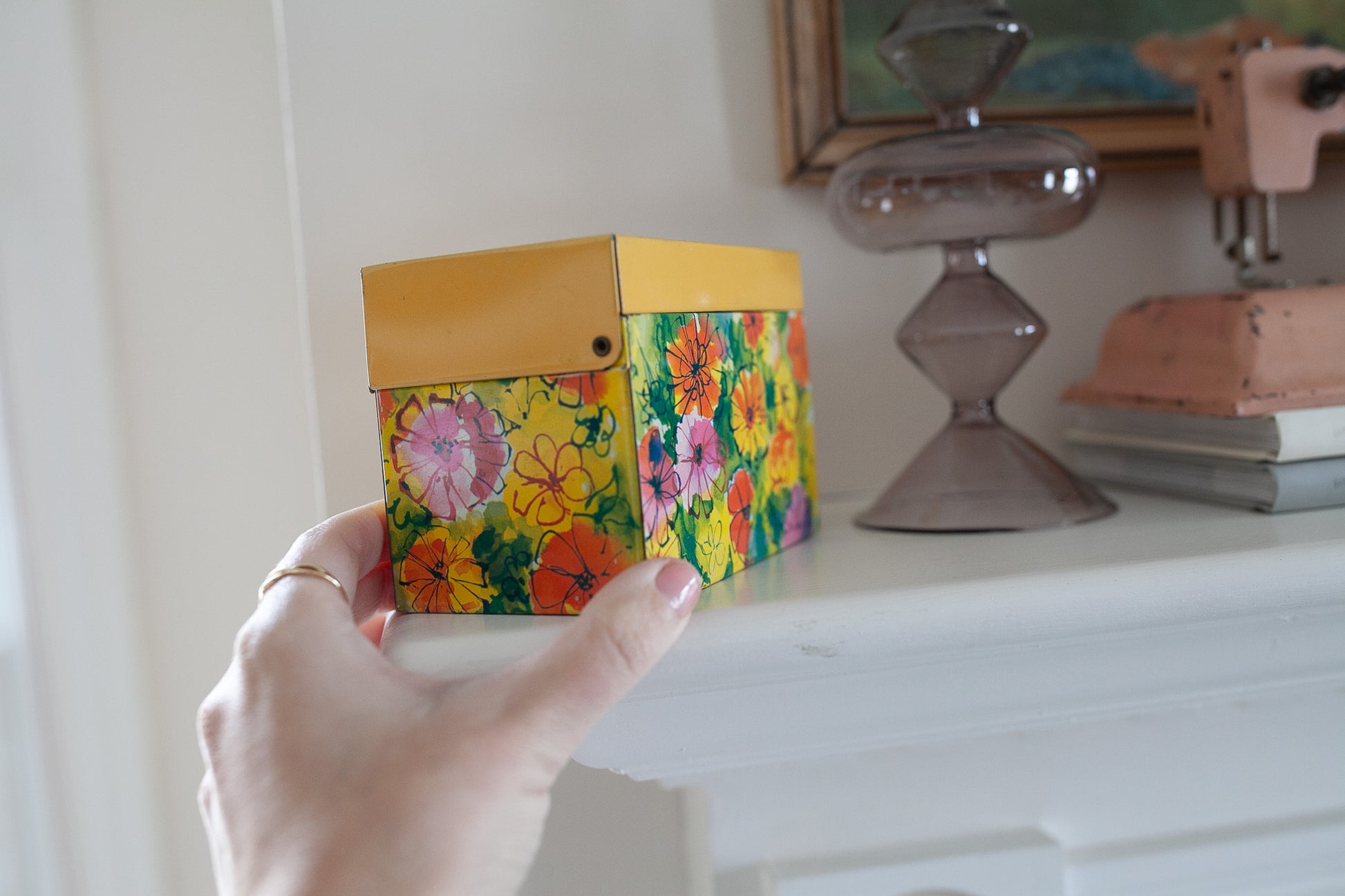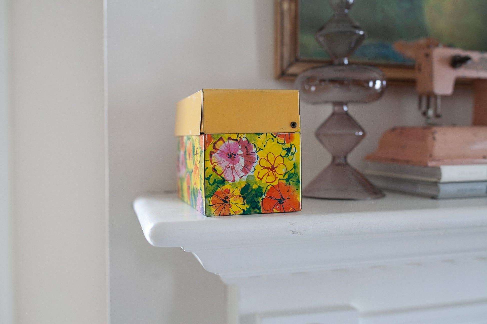 The small, rectangular box features a bright floral print on a yellow background, making it a cheerful addition to your kitchen storage and organization. Measuring about 5.25 inches in length, 3.75 inches in height, and 3 inches in width, this original piece is made of durable metal and is easy to clean. This recipe tin is sweet with great florals and a yellow lid.