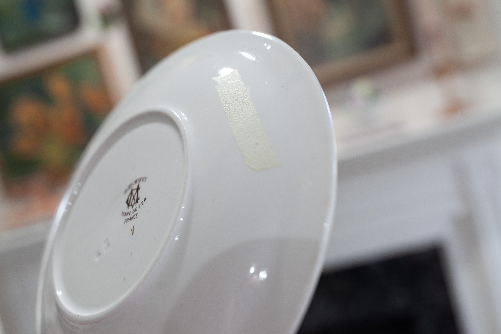 Marked on the back- Terre De Fer France- and is about 8.75" in diameter. One tiny little chip in the edge rim. It is in good shape besides some light paint wear and this one small little chip.