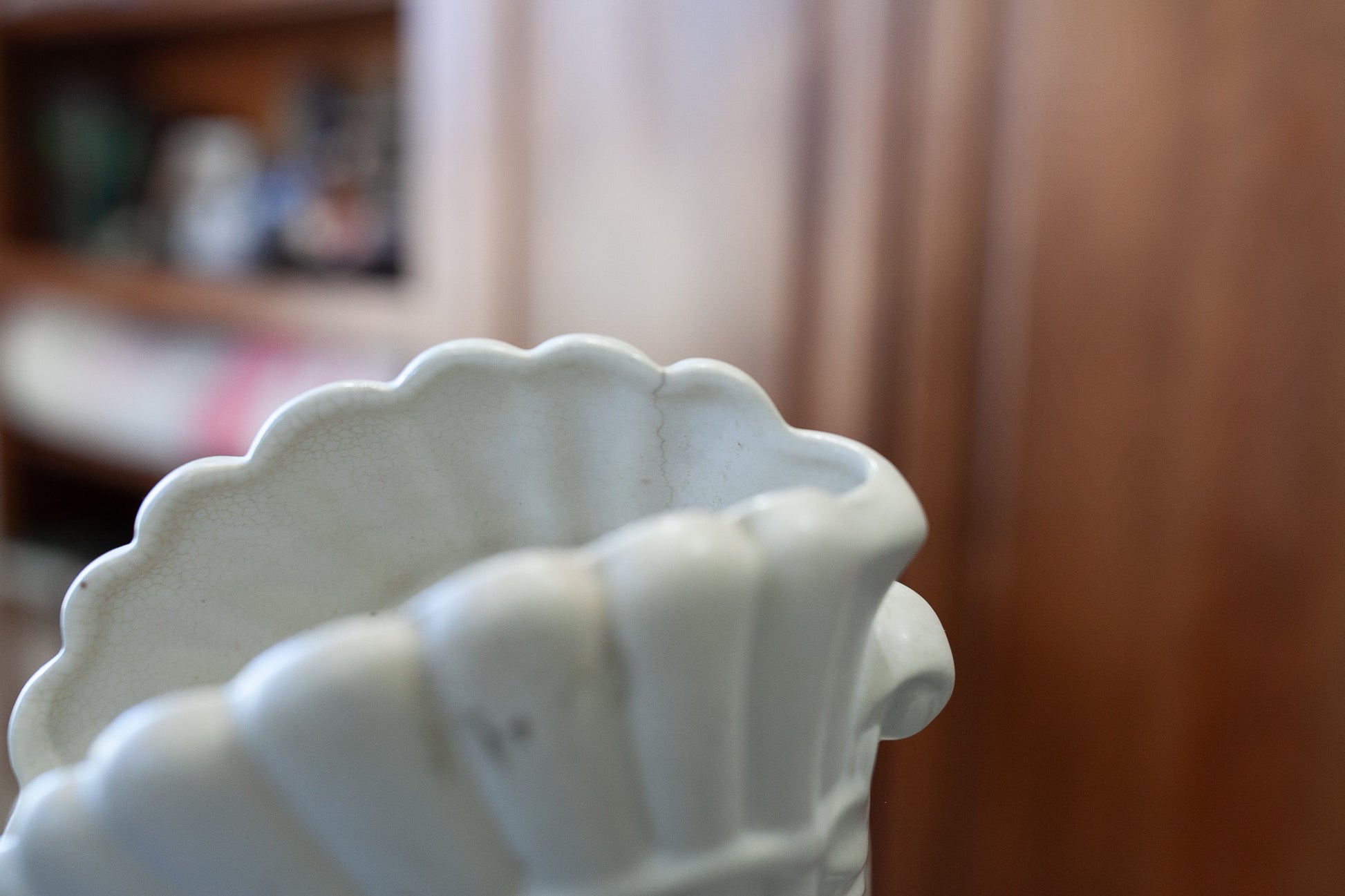 This is vintage vase made in Japan that looks to have a shell like shape. It has some wear to the pottery with some crazing lines  around the vase. There is a chip on the inside of the top of the vase- can't be seen from the outside. There were some darker marks on one side, but they did clean up after the photos were taken. This vase is about 7" tall and about 6" wide.