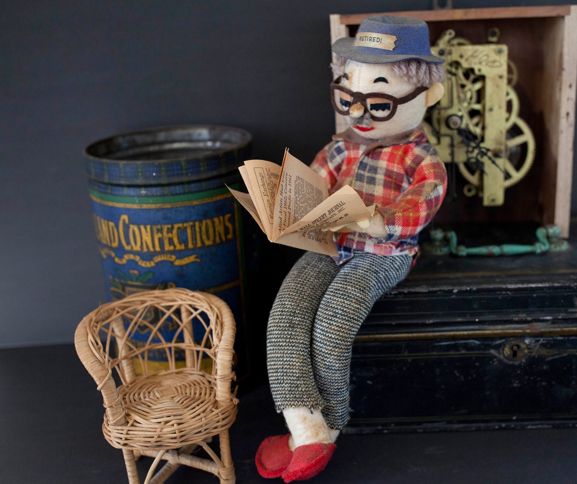 This is the best doll! He is a Retired older man sitting in a wicker chair and reading the Wall Street Journal. He is so cute with his glasses on and red slippers. He is made of all soft materials. His chair fits him perfectly but he is not attached to the chair. About 10" tall sitting.