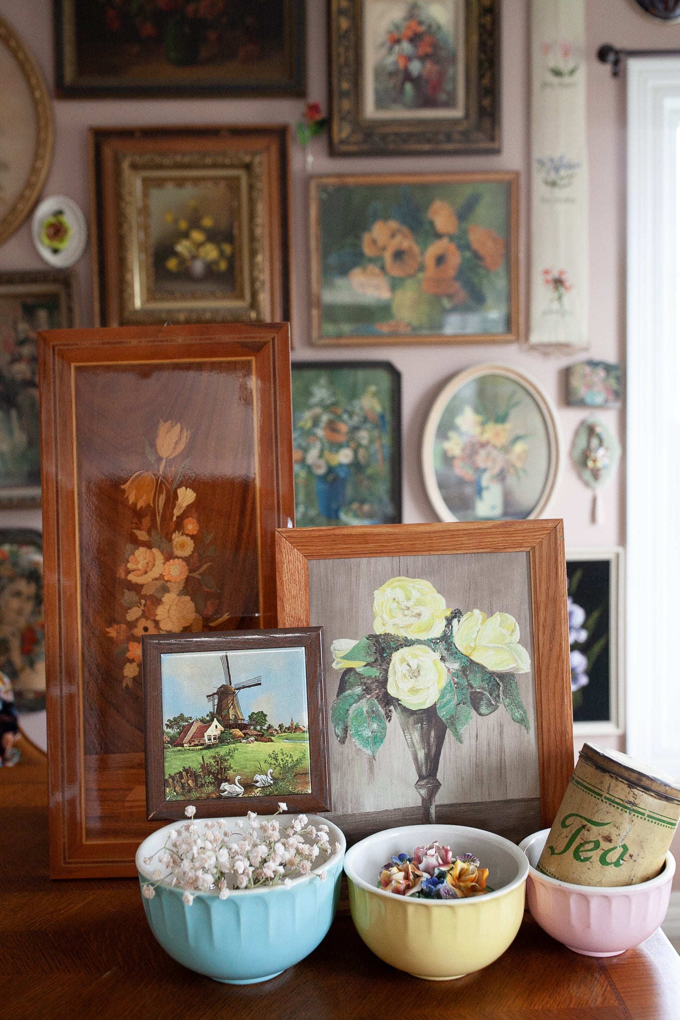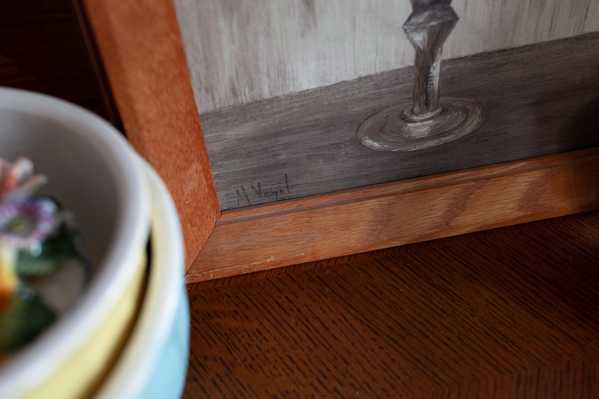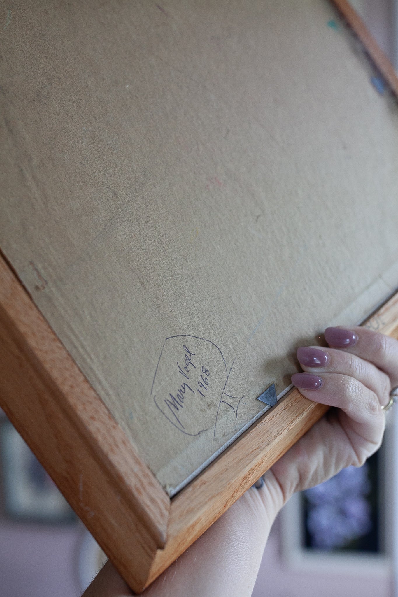 This vintage floral is about 16"x12" in size. It is a painted board that has been framed in a nice wood frame. It is in good shape. Signed M Vogel in the lower left side. It was painted in 1968. It has a wire on the back to hang with.