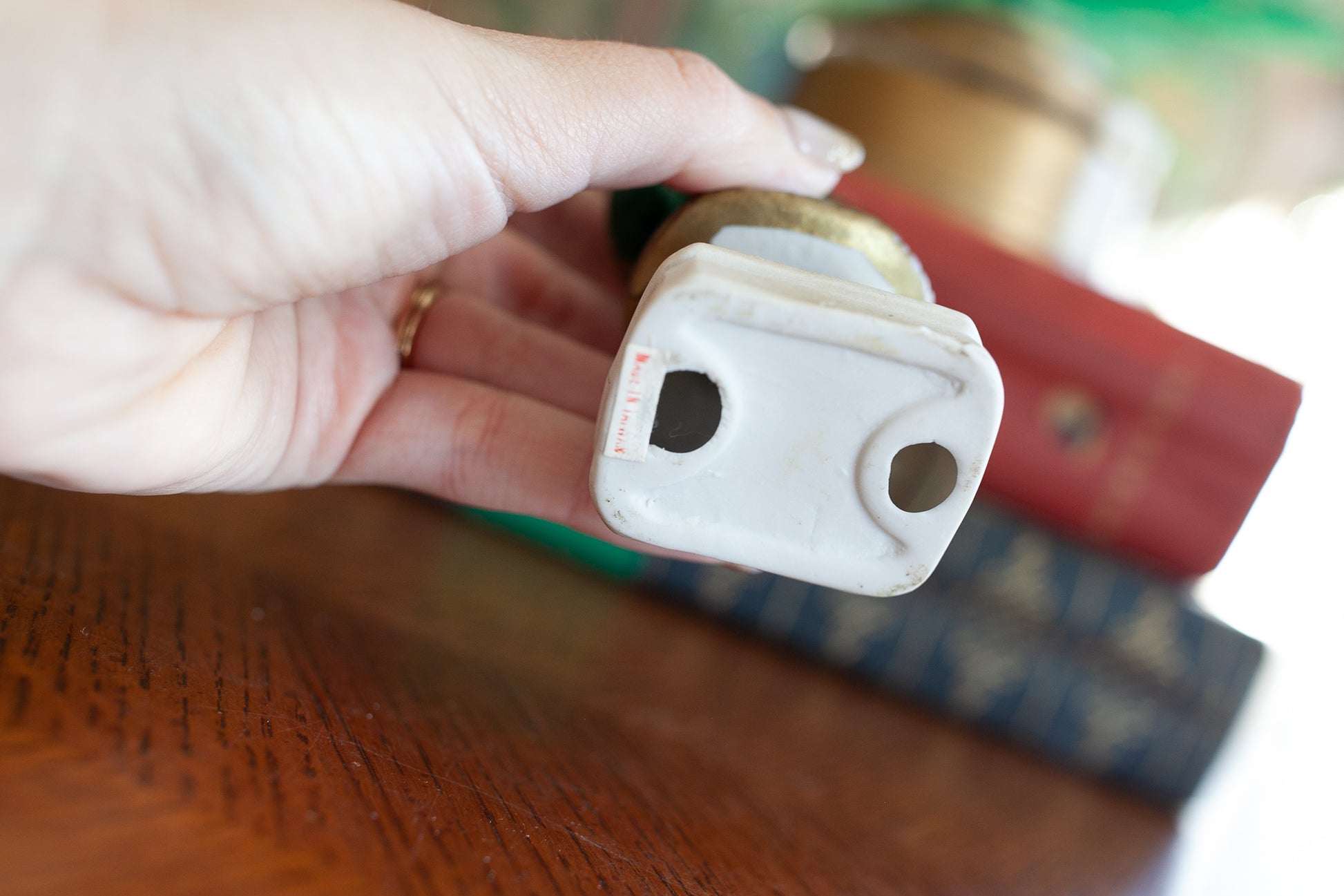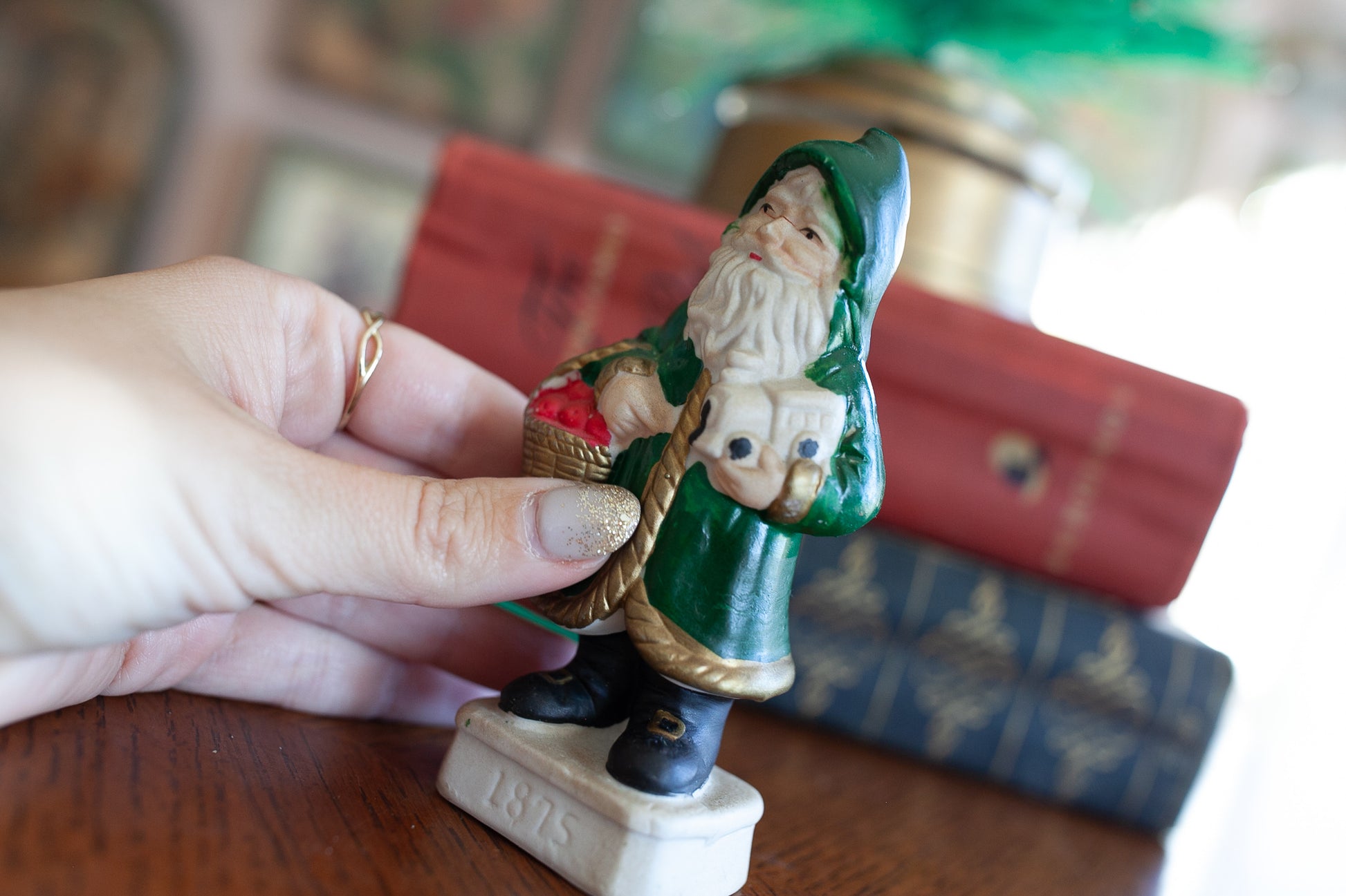 This little Santa is so sweet! He is dressed in green and is holding apples and a toy train- all made of porcelain. The base says 1875 on the front of it. No chips or cracks.