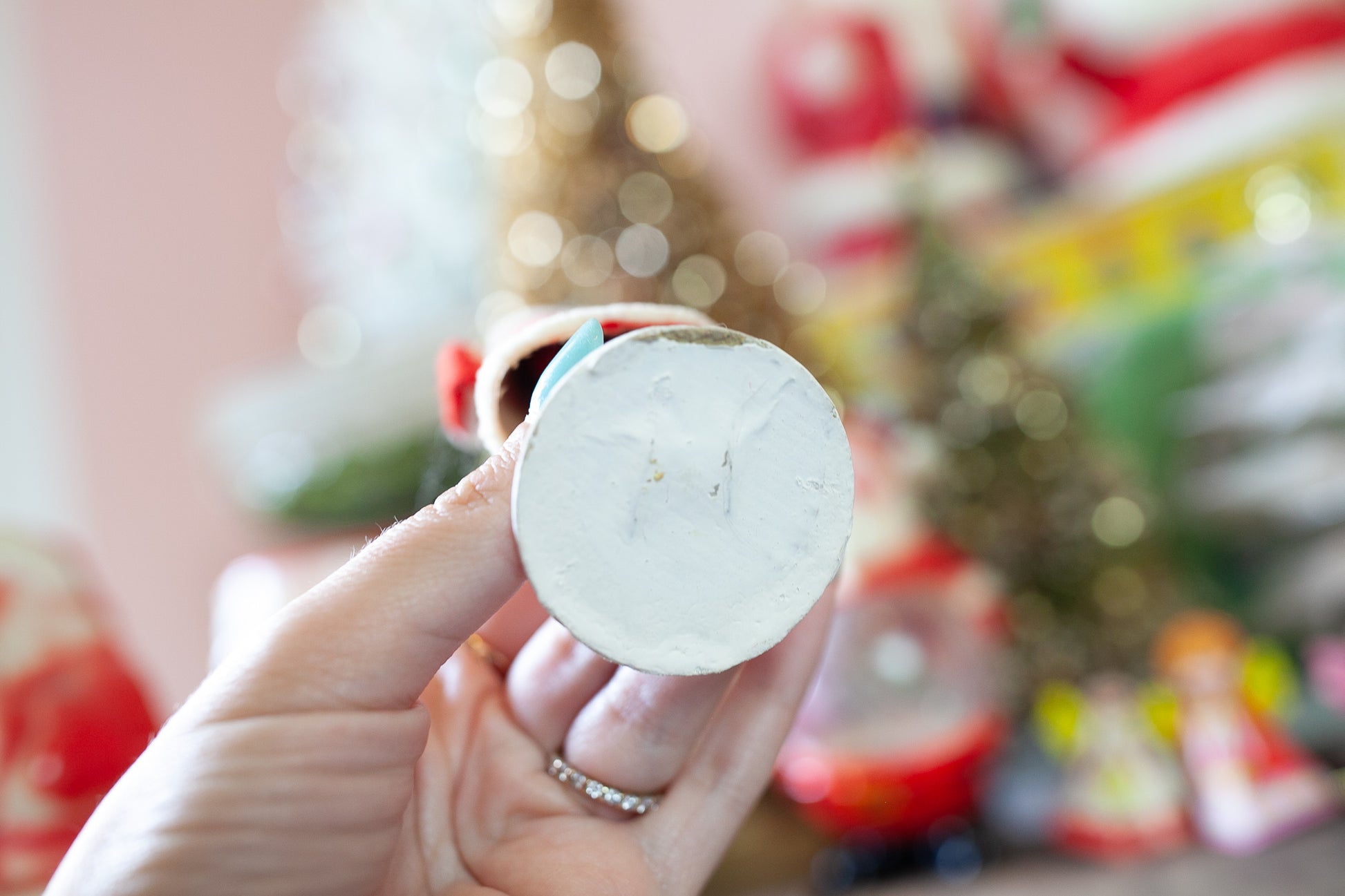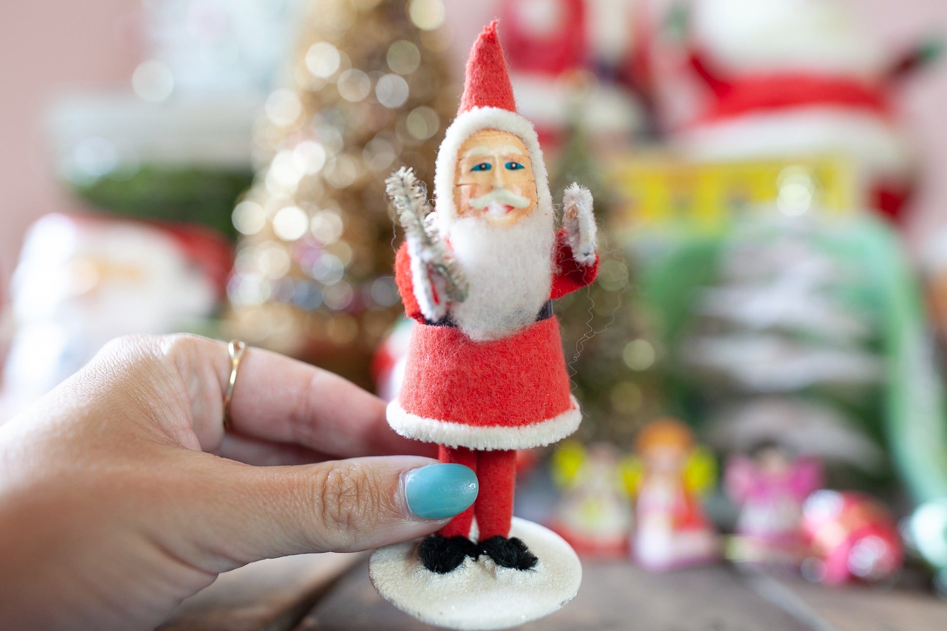 This little guy is about 5" tall. He is in great condition and stands on a little base. Made of cloth, felt, pipe cleaner, and paper mache composition face. He is darling! A split starting in his belt- may eventually need a little tape- otherwise great condition.
