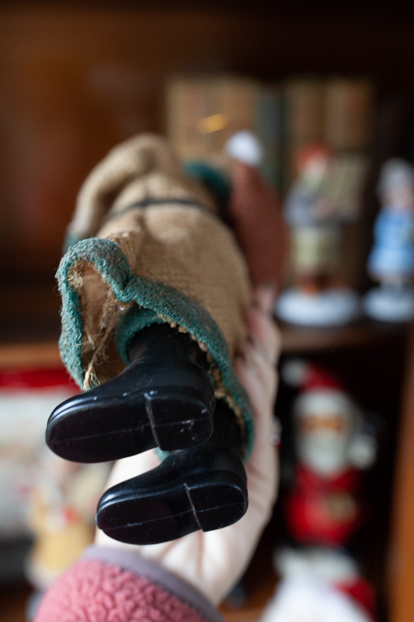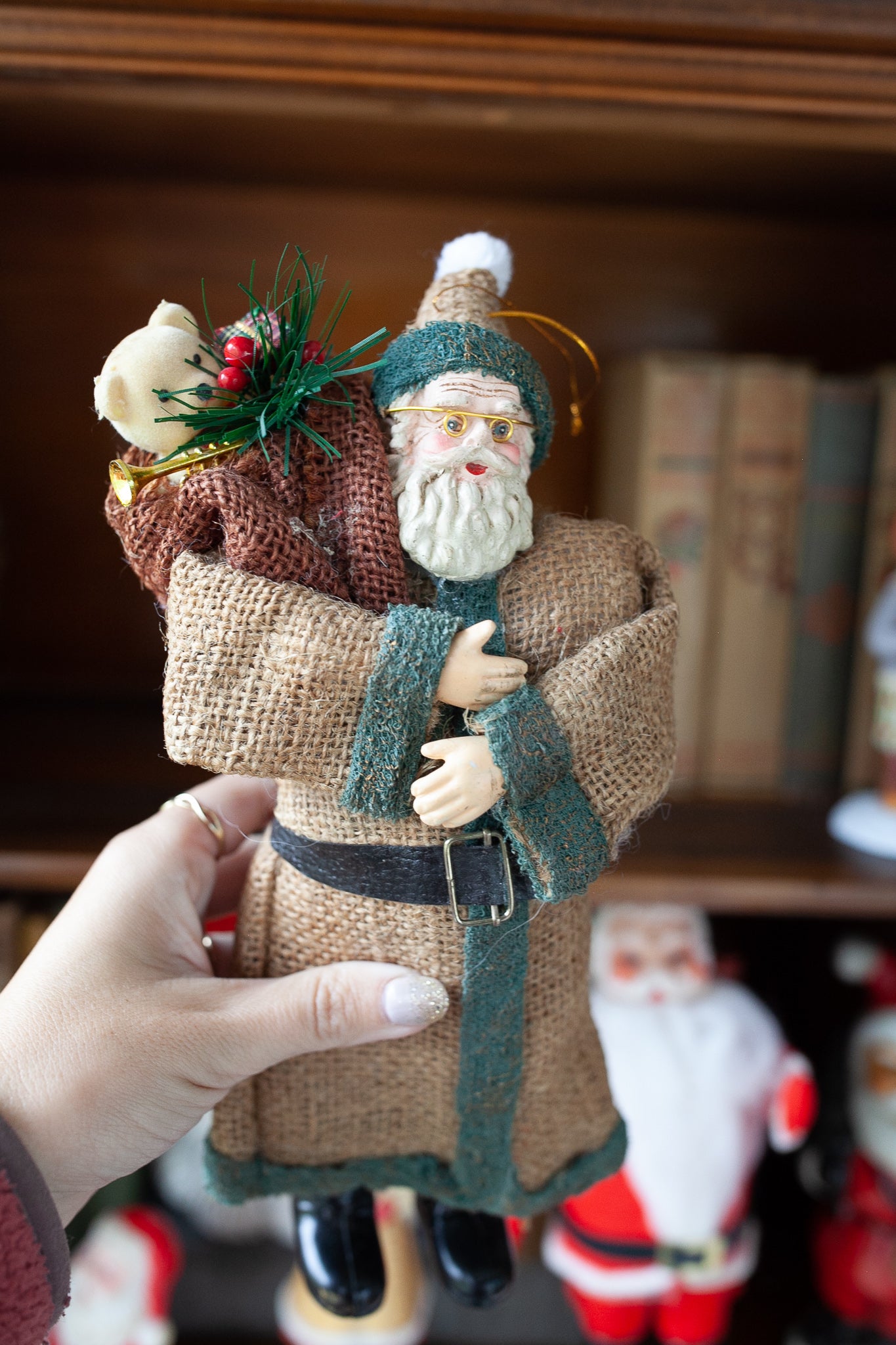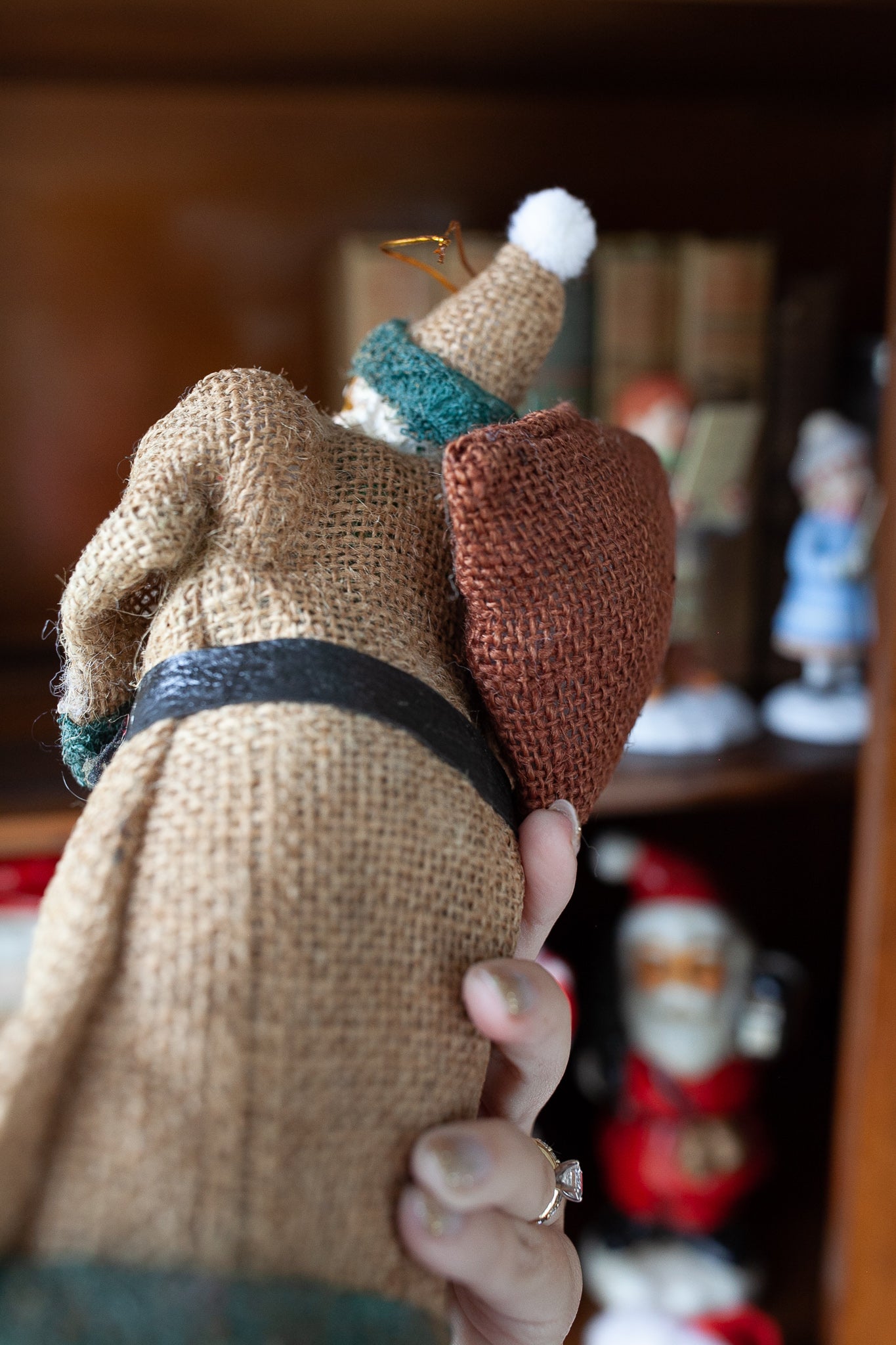 This Santa is sweet and stands about 12" tall. He has a burlap coat on and is holding a bag with a teddy bear inside. He has tiny gold glasses on his face and a stocking hat.