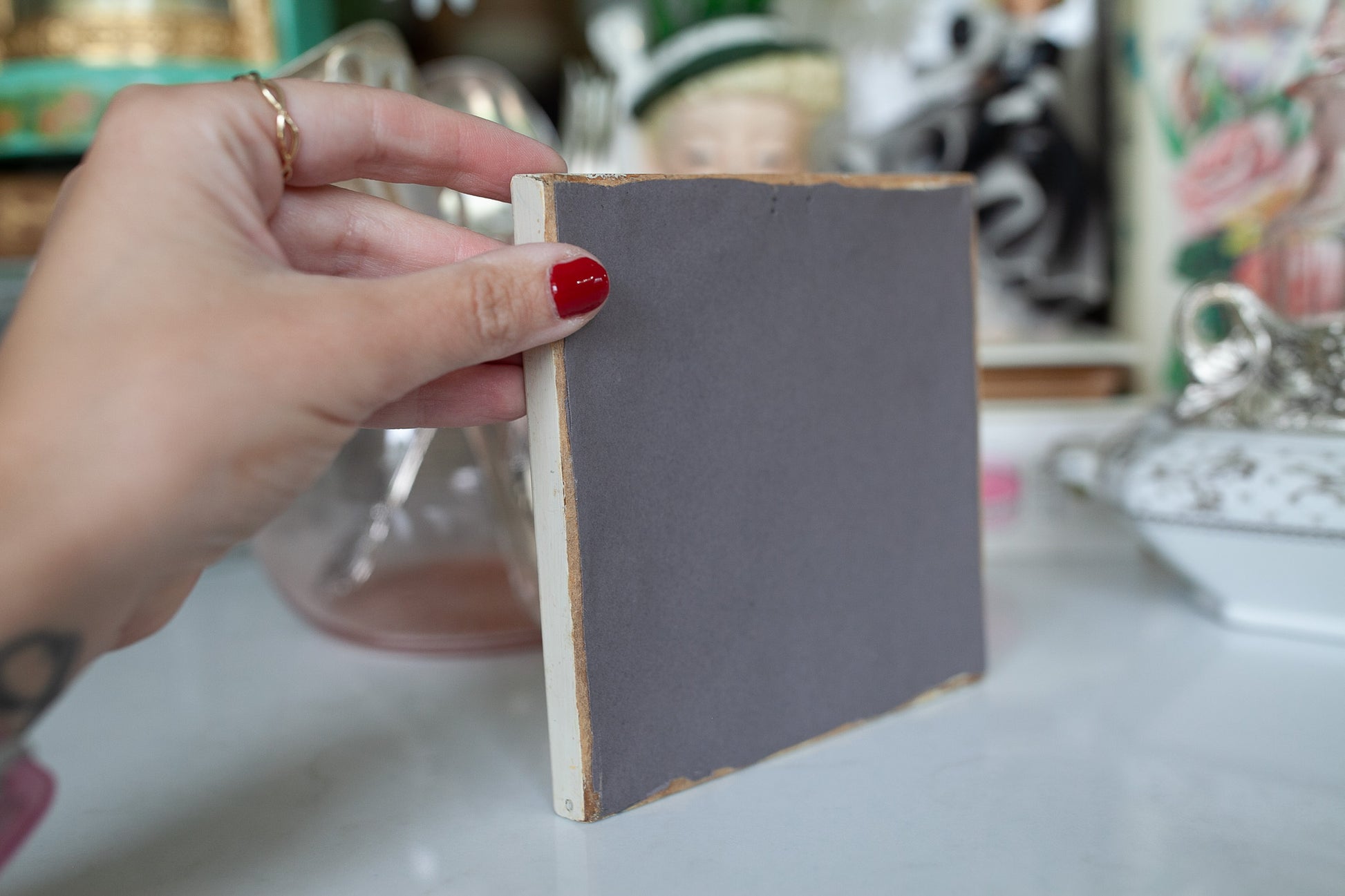 5.5"x5.5" in size- This piece shoes a couple together in front of a gate. They are reverse painted and in good condition. There is a little bit of paint missing in some areas, but overall still holding up.