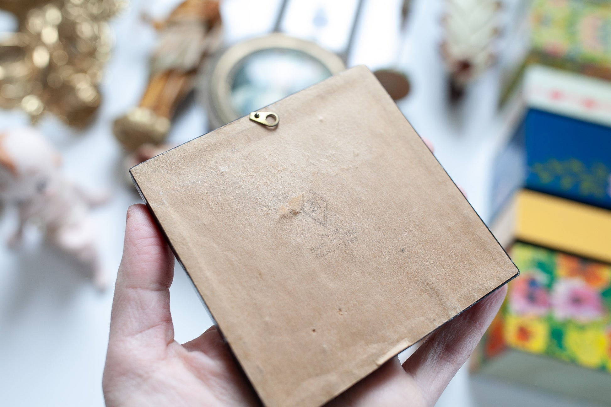 This is a reverse painting with milkweed. It is 4” square with glass enclosed in a black wood frame. The frame has a gold outline.