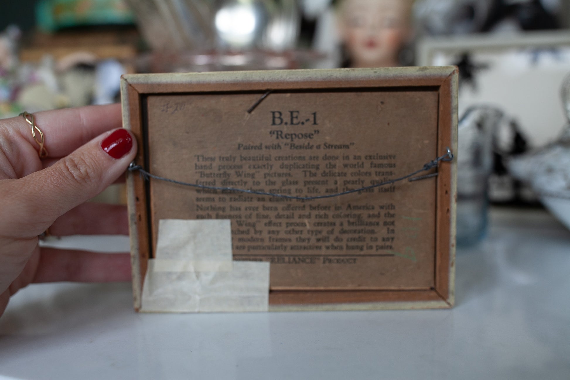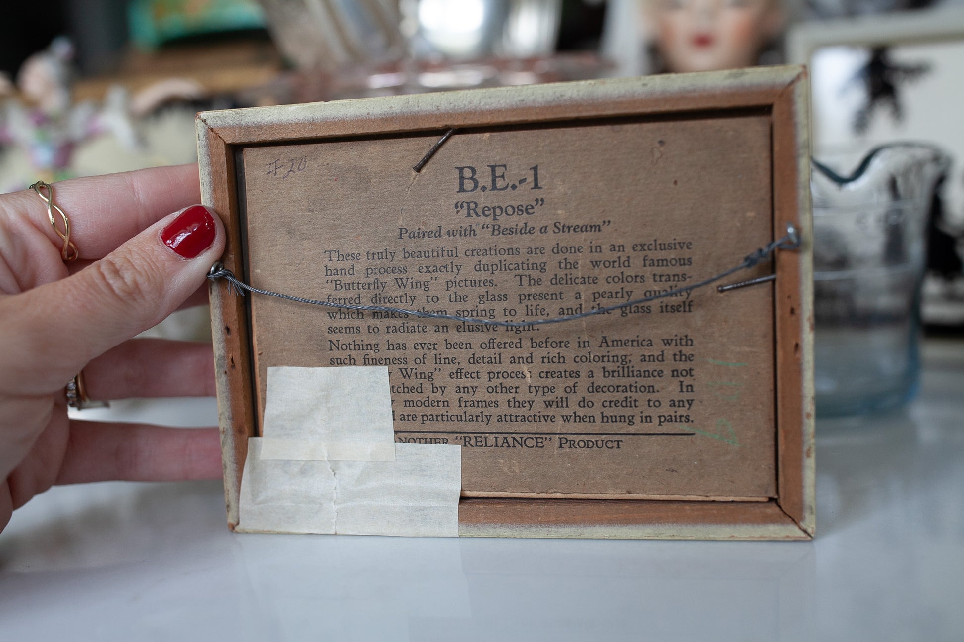 5.75"x4.25" in size- this is such a beautiful piece and in great condition. There is a little wire on the back to hang with. There are a few piece of tape in the lower left corner. It says "Repose" and a description of how it was made.