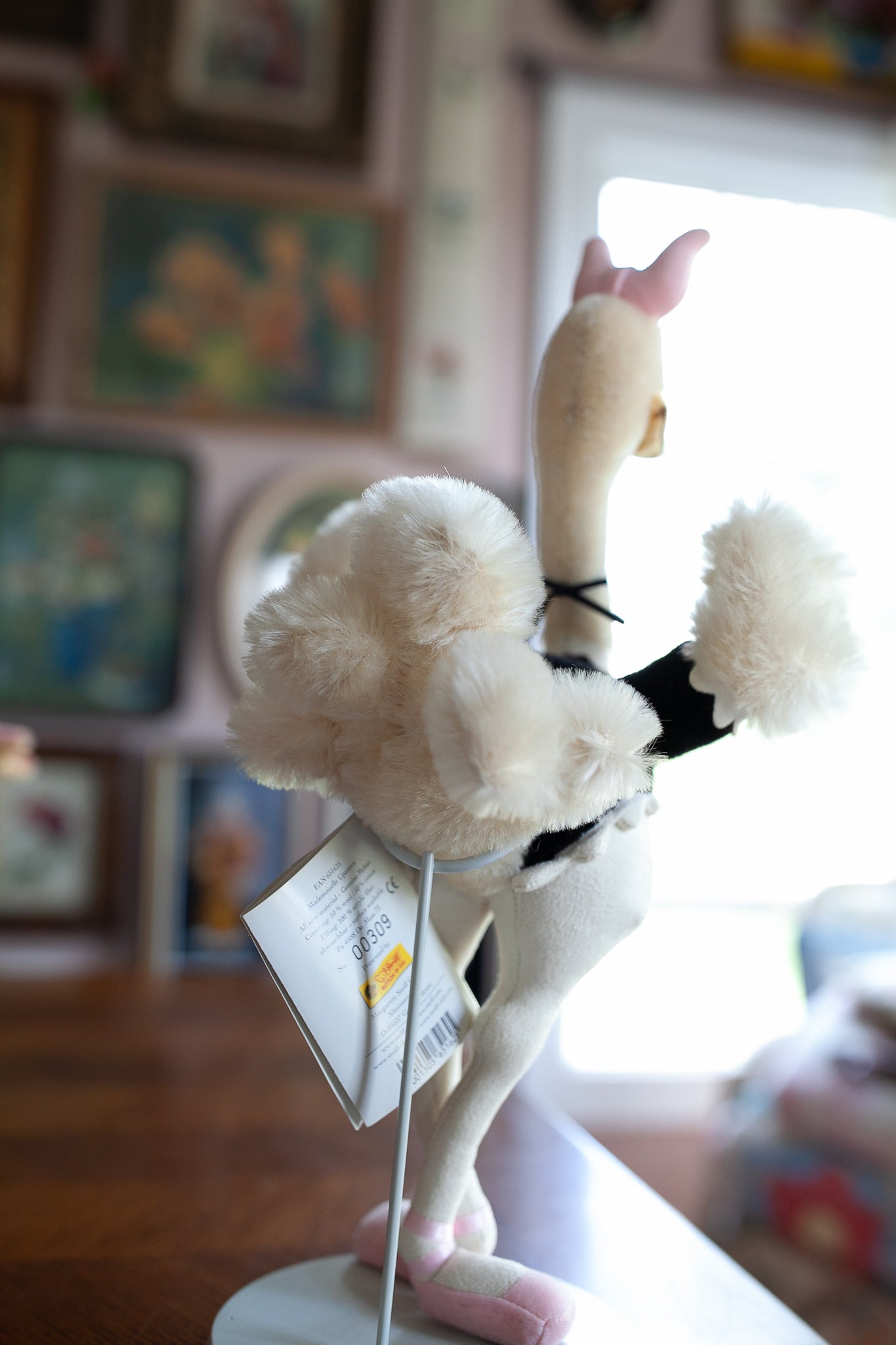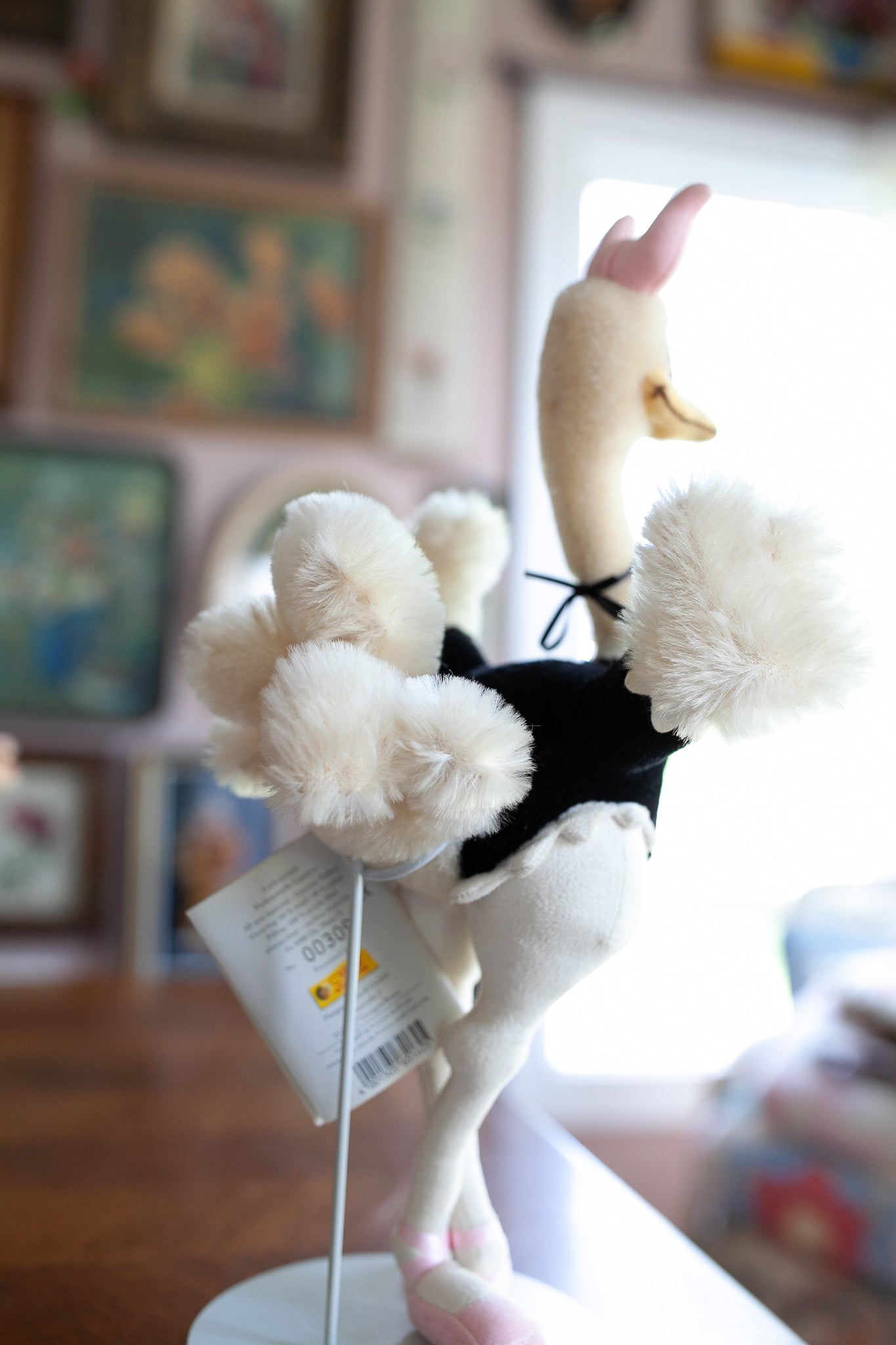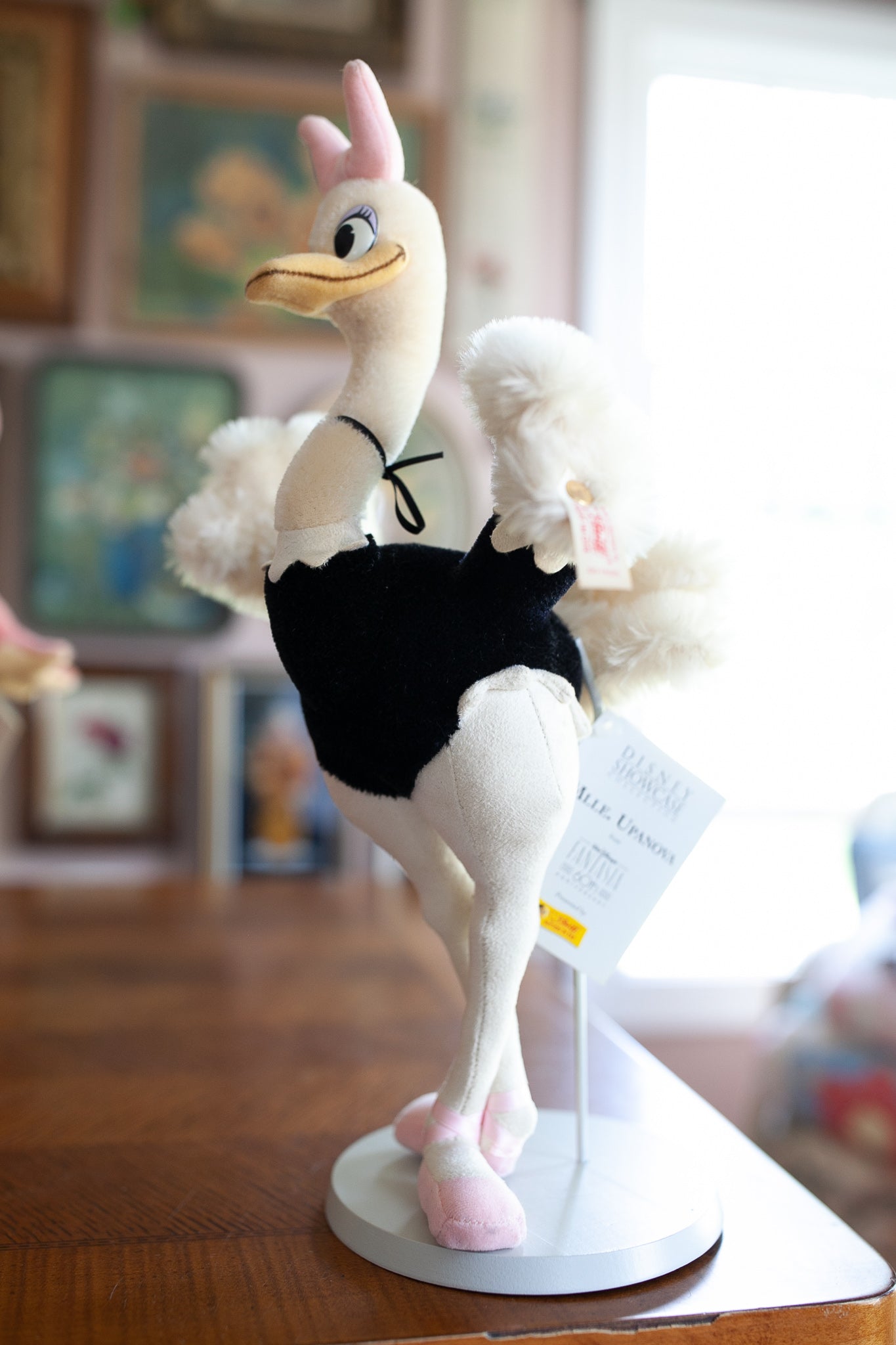 Celebrating the 60th Anniversary of the Disney's Fantasia, Margarete Steiff GmbH presents, Mademoiselle Upanova. This lady ostrich is handcrafted in the finest mohair plush and Ultrasuede and is limited to 2000 pieces worldwide. Beautiful details like pink ballet shores, a pink bow in her hair and the gold Steiff Button in her left wing emphasizing the appeal of this collector's item. This item has a stand included with measurements 8"H x 5.5" dia. She stands about 14.75" tall. Original tag still attached to her.