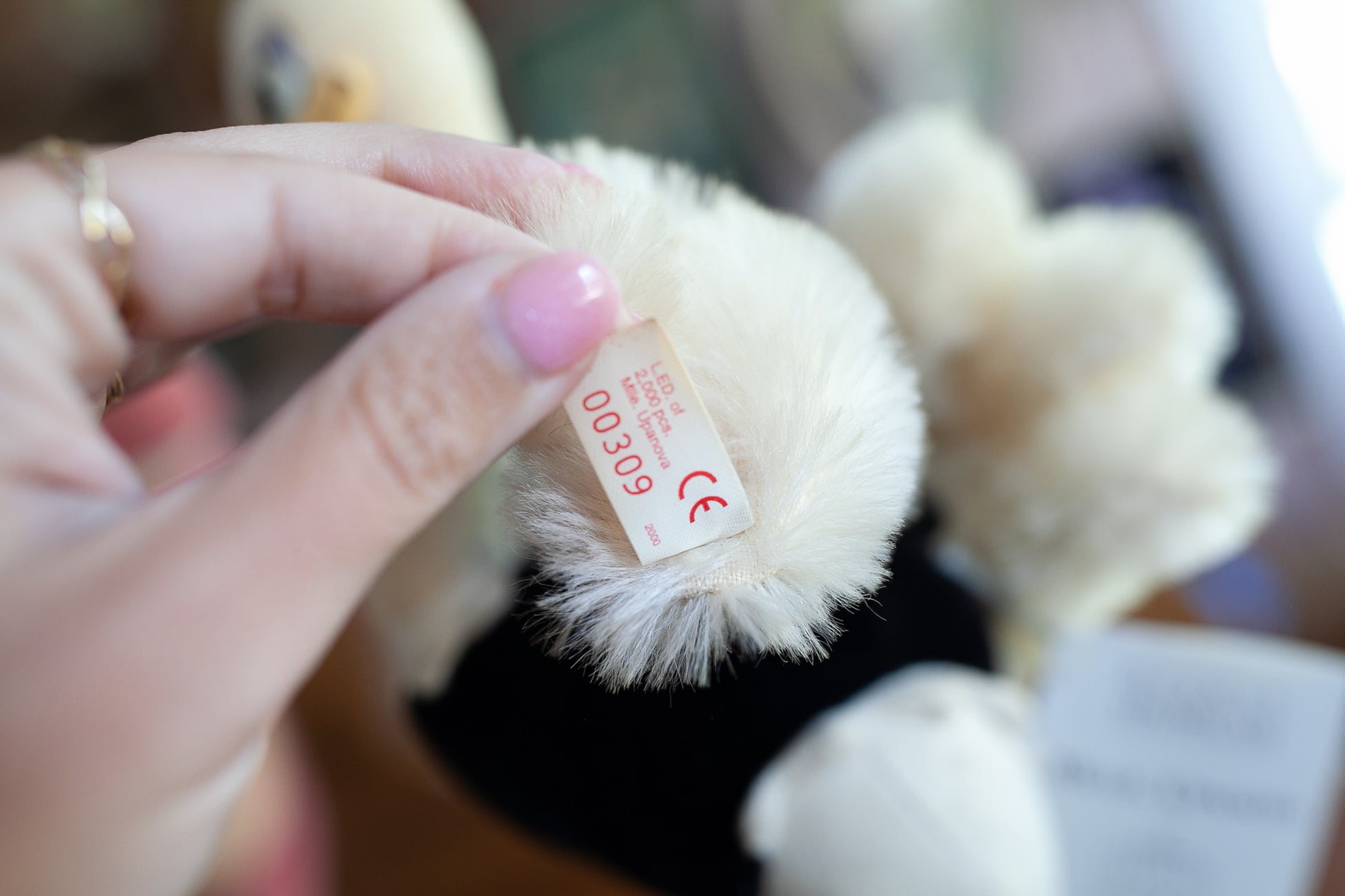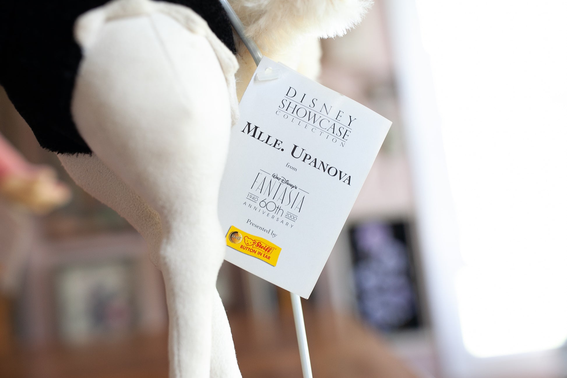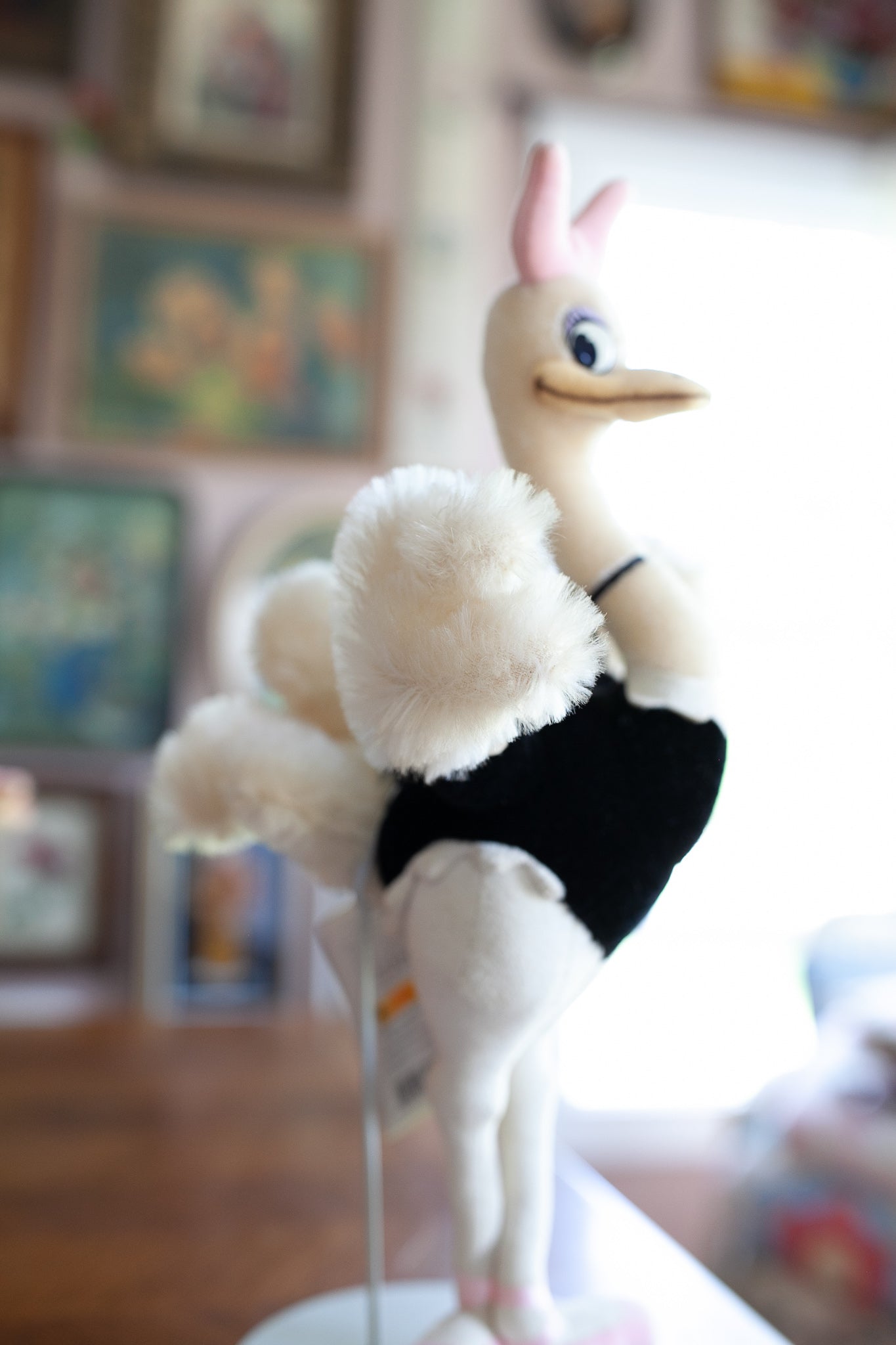 Celebrating the 60th Anniversary of the Disney's Fantasia, Margarete Steiff GmbH presents, Mademoiselle Upanova. This lady ostrich is handcrafted in the finest mohair plush and Ultrasuede and is limited to 2000 pieces worldwide. Beautiful details like pink ballet shores, a pink bow in her hair and the gold Steiff Button in her left wing emphasizing the appeal of this collector's item. This item has a stand included with measurements 8"H x 5.5" dia. She stands about 14.75" tall. Original tag still attached to her.