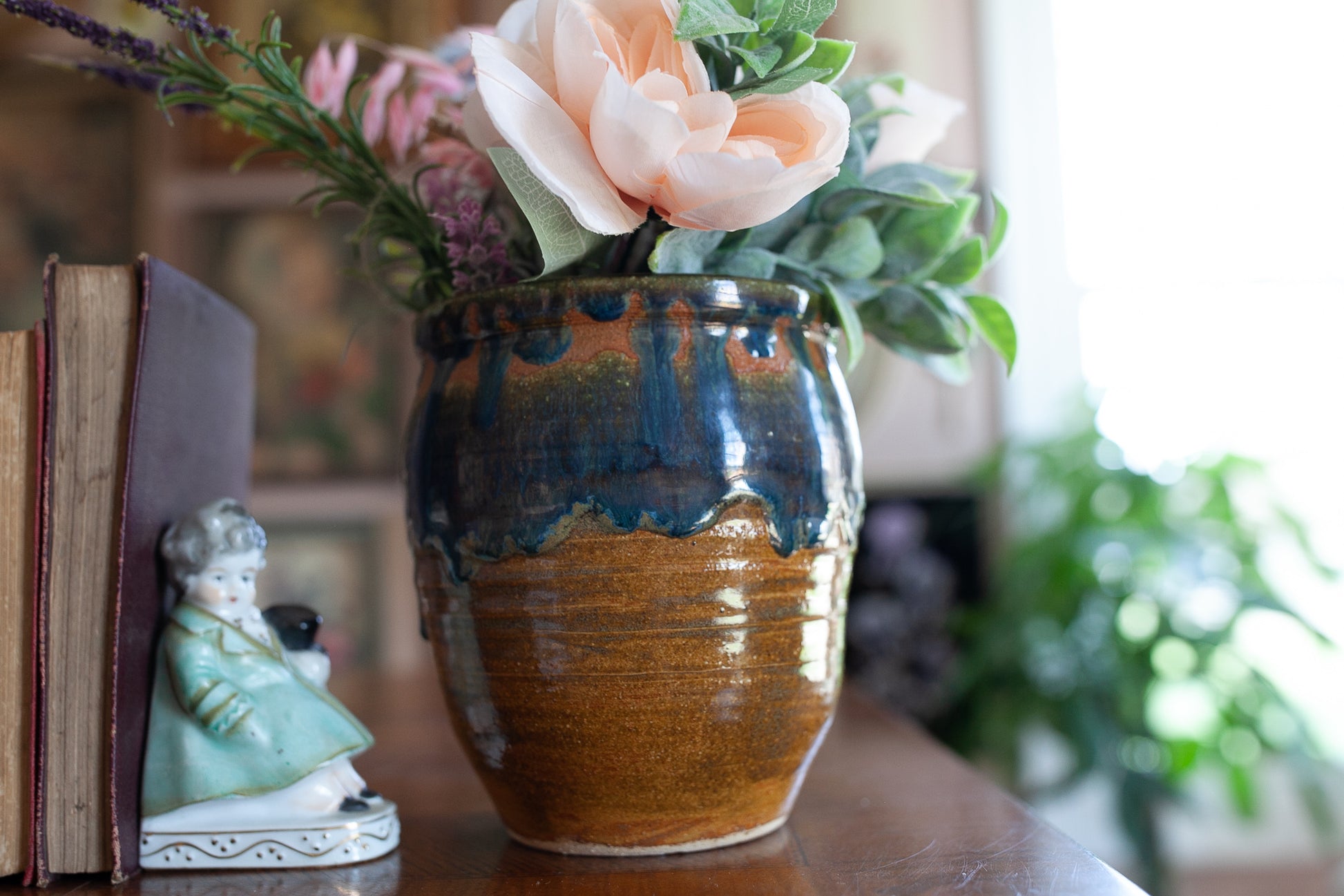 This stone vase is a pottery piece that is marked Kim Thatcher I believe on the base. It has great colors and stands about 6.25" tall and about 5" diameter. No chips or cracks.
