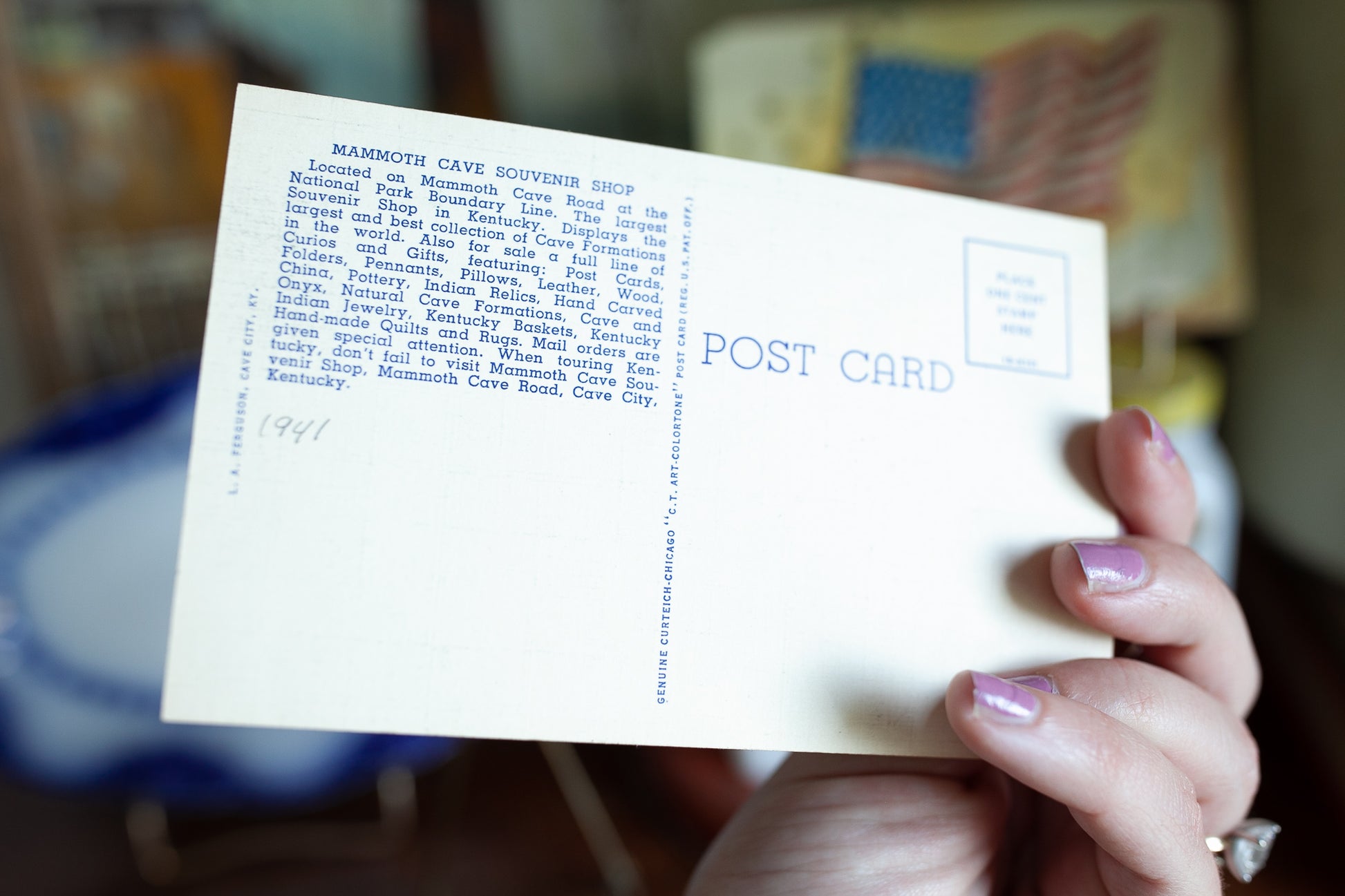 This vintage postcard is just the perfect little summer card to display! It comes with the little gold easel that it is displayed on as well! The postcard shows Mammoth Cave Souvenir shop with a big American flag on top of the store! It looks to be having a rummage sale outside and is just the epitome of summer isn't it?!