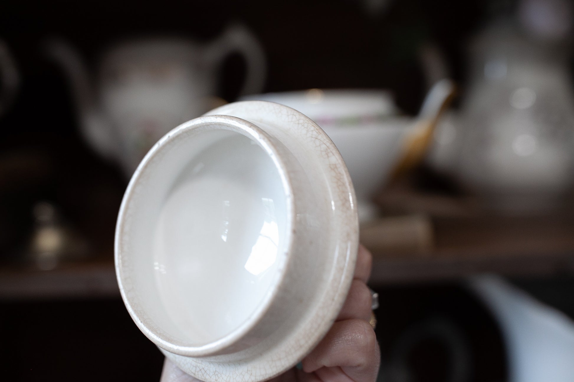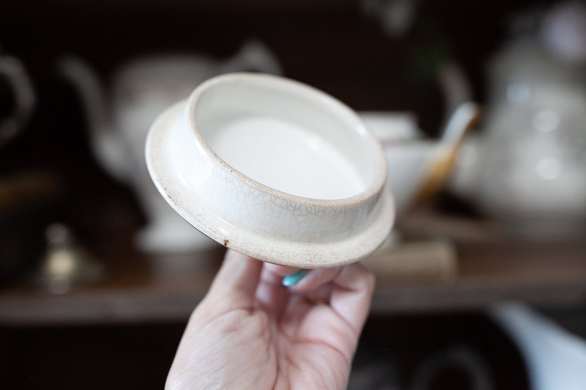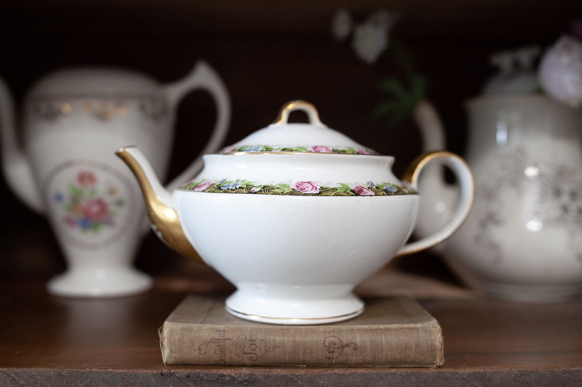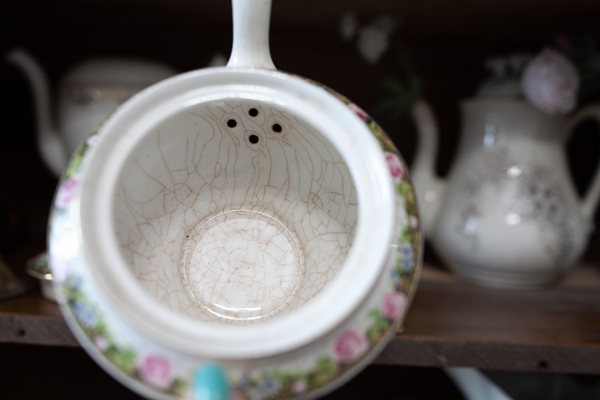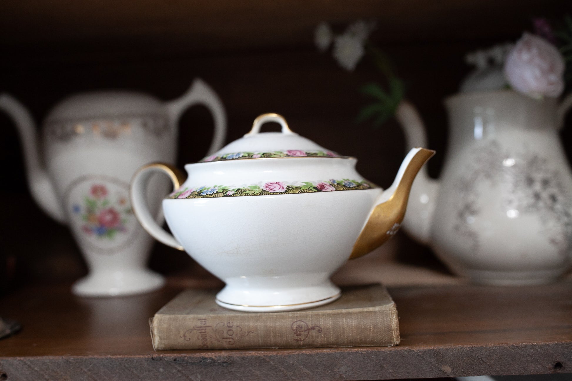 This is an old lovely little teapot! It is porcelain and heavily crazed and stained. It has roses around the top and on the lid. It has some gold detail on the handles and spout. The gold has some wear to it and some spots are missing the gold detail. The teapot is about 4.25" tall (5.5" to top of the lid) and about 9" spout to handle wide. No chips or cracks. Inside is heavily crazed as well- probably best just for display at this time.