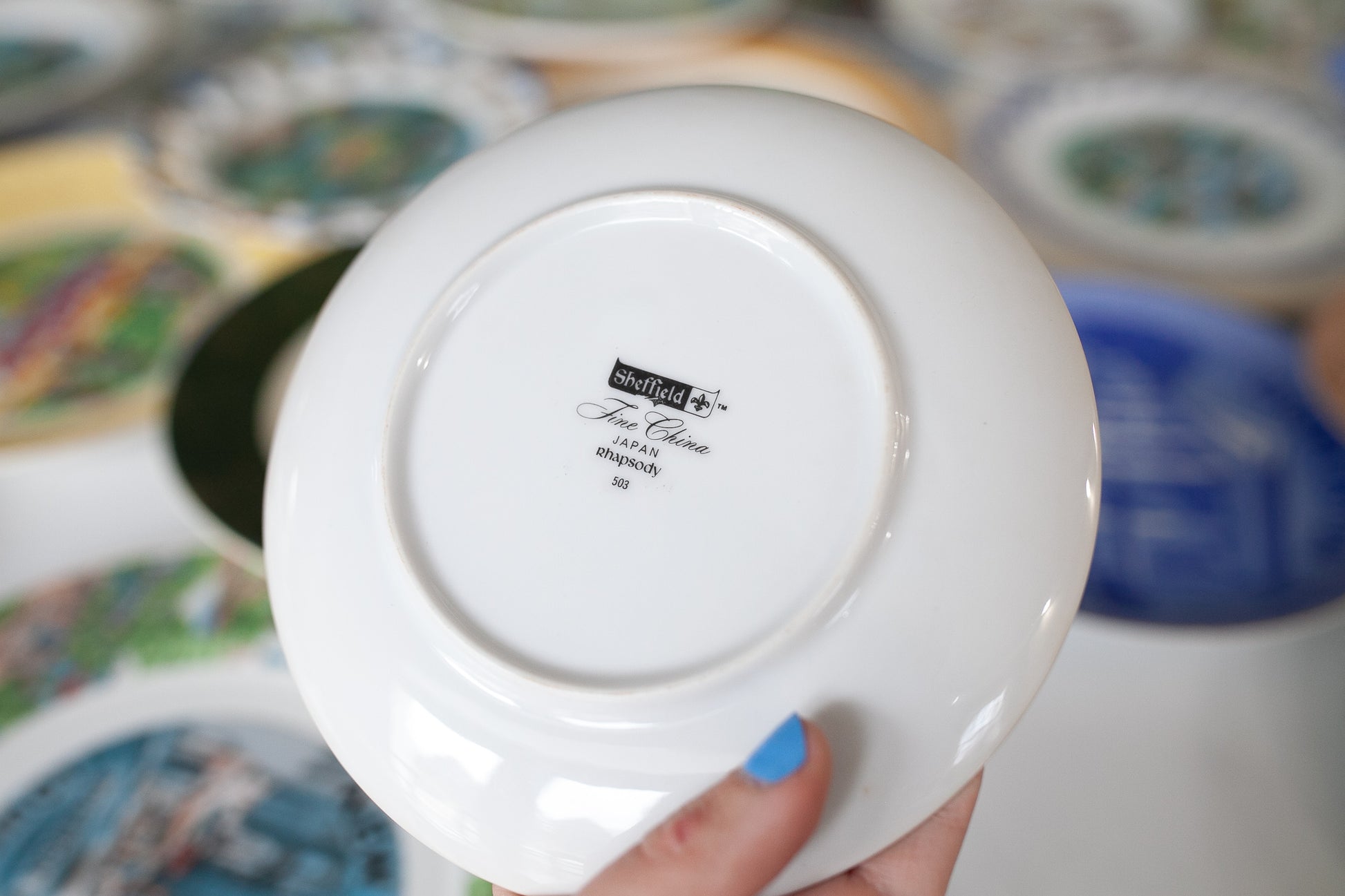 This little plate is so pretty with blue dainty flowers around the edge. The State House is pictured in the center. The back says Sheffield Fine China Japan Rhapsody 503 on the back. This plate is about 6.5" in diameter.