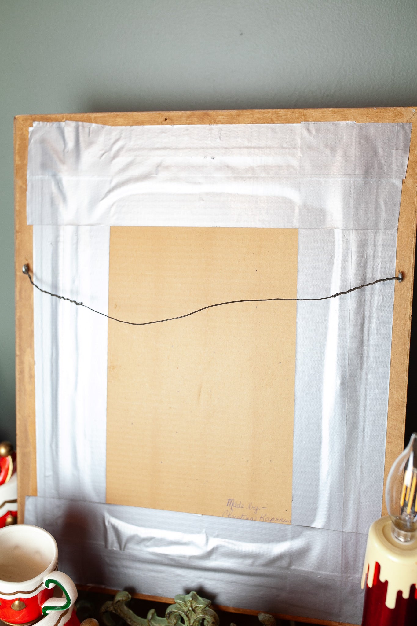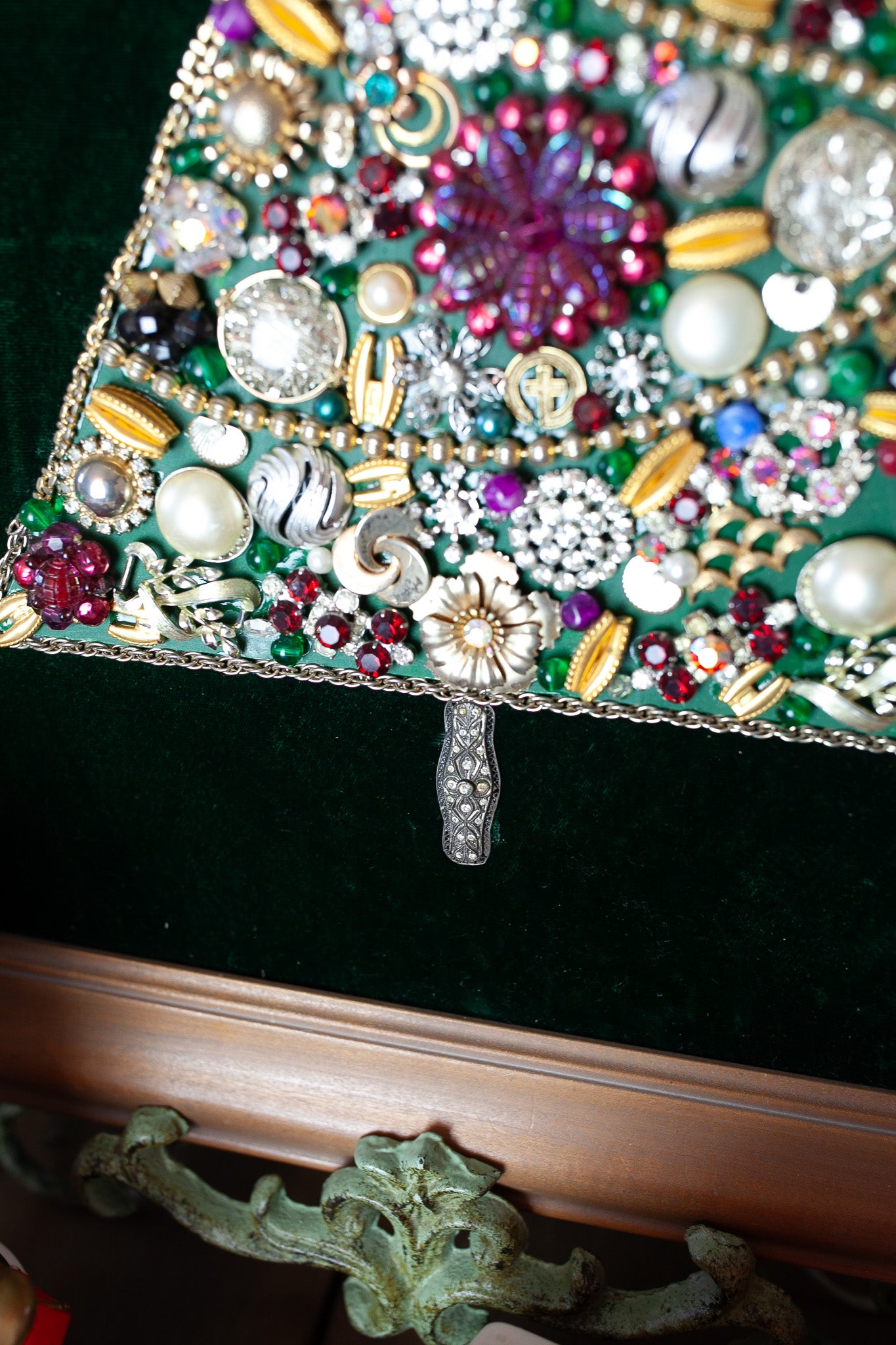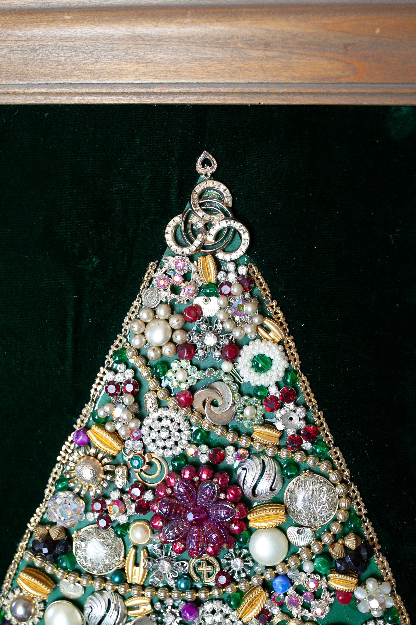 Vintage Tree handmade with a green velvet background, a wood frame, and many small pieces of jewelry. It is about 19.5"x15.5". It has duct tape on the back, but the hanging wire is in good shape! A fun Christmas display for sure!