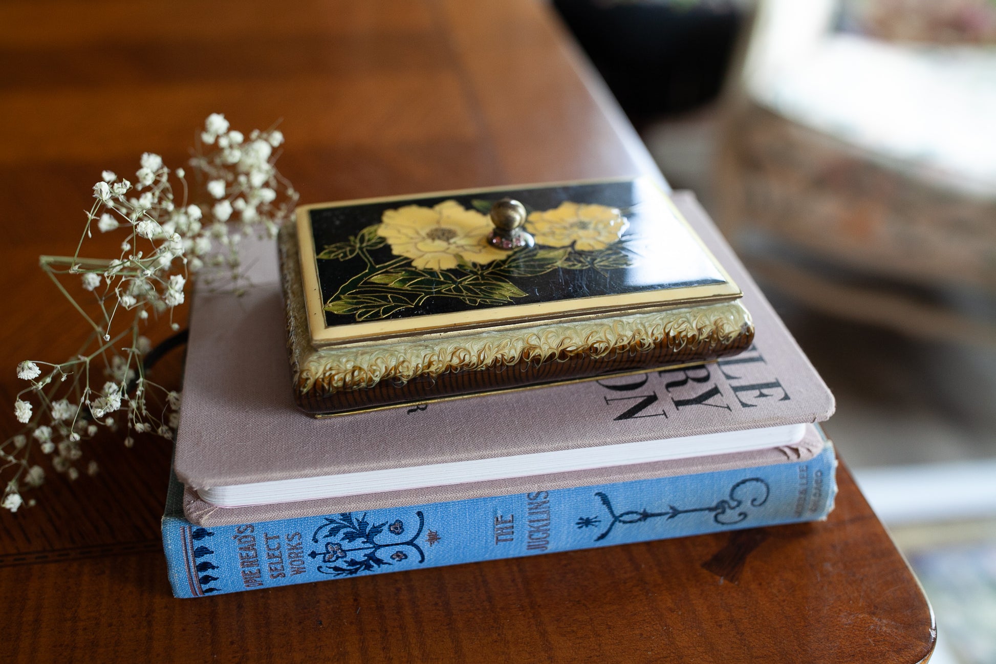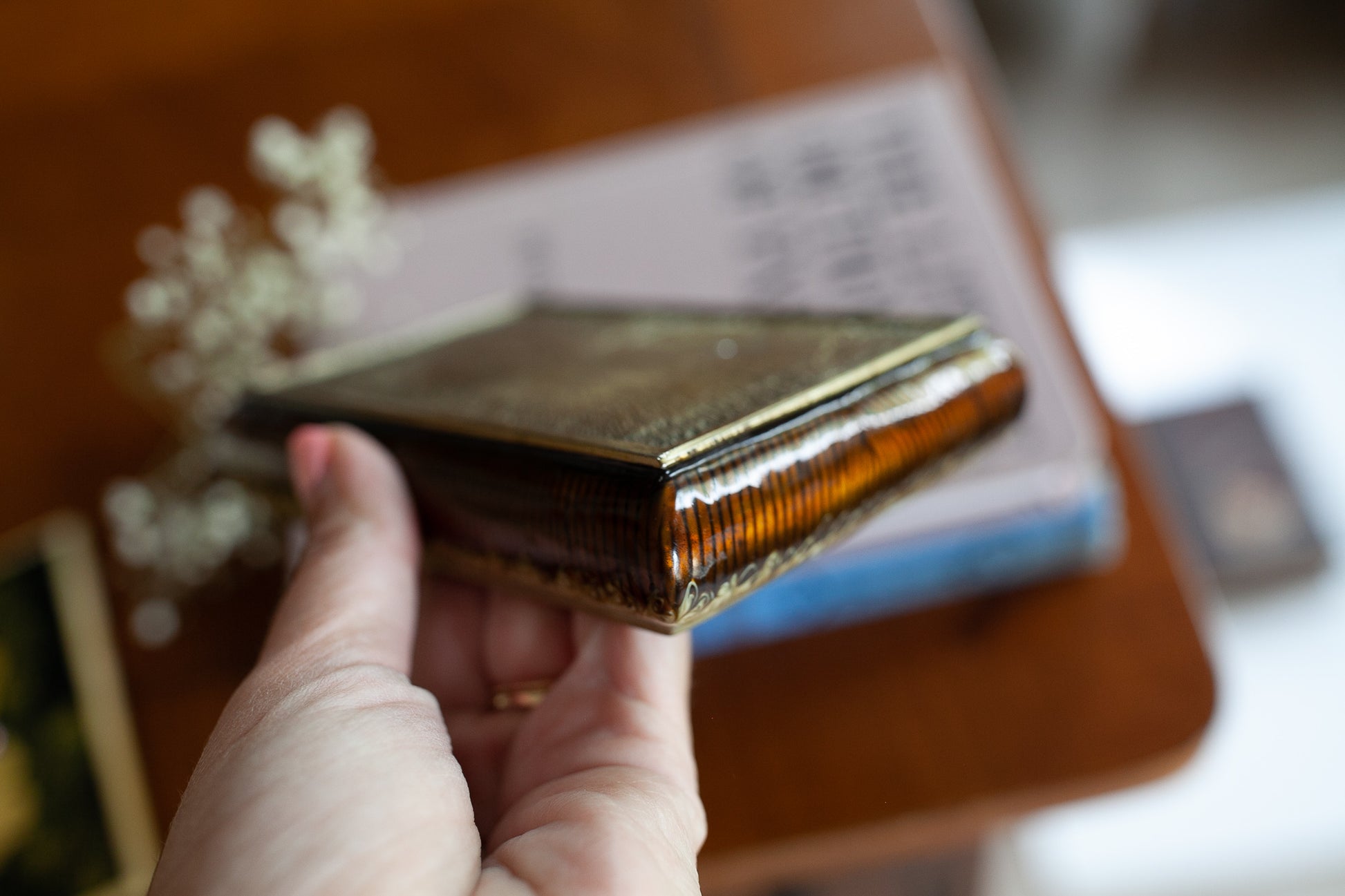 This pretty trinket box is so neat with what looks like enamel work- the lid has two big yellow flowers and the base has almost a tortoise shell look to the design. It is heavy and solid and about 5"x3.25" x1.25" in size. The knob on the lid is surrounded by light pink rhinestones. Overall good condition with just some light scratches on the top of the lid from past use.