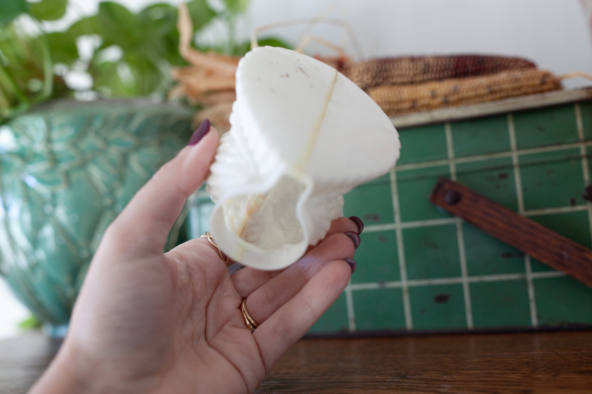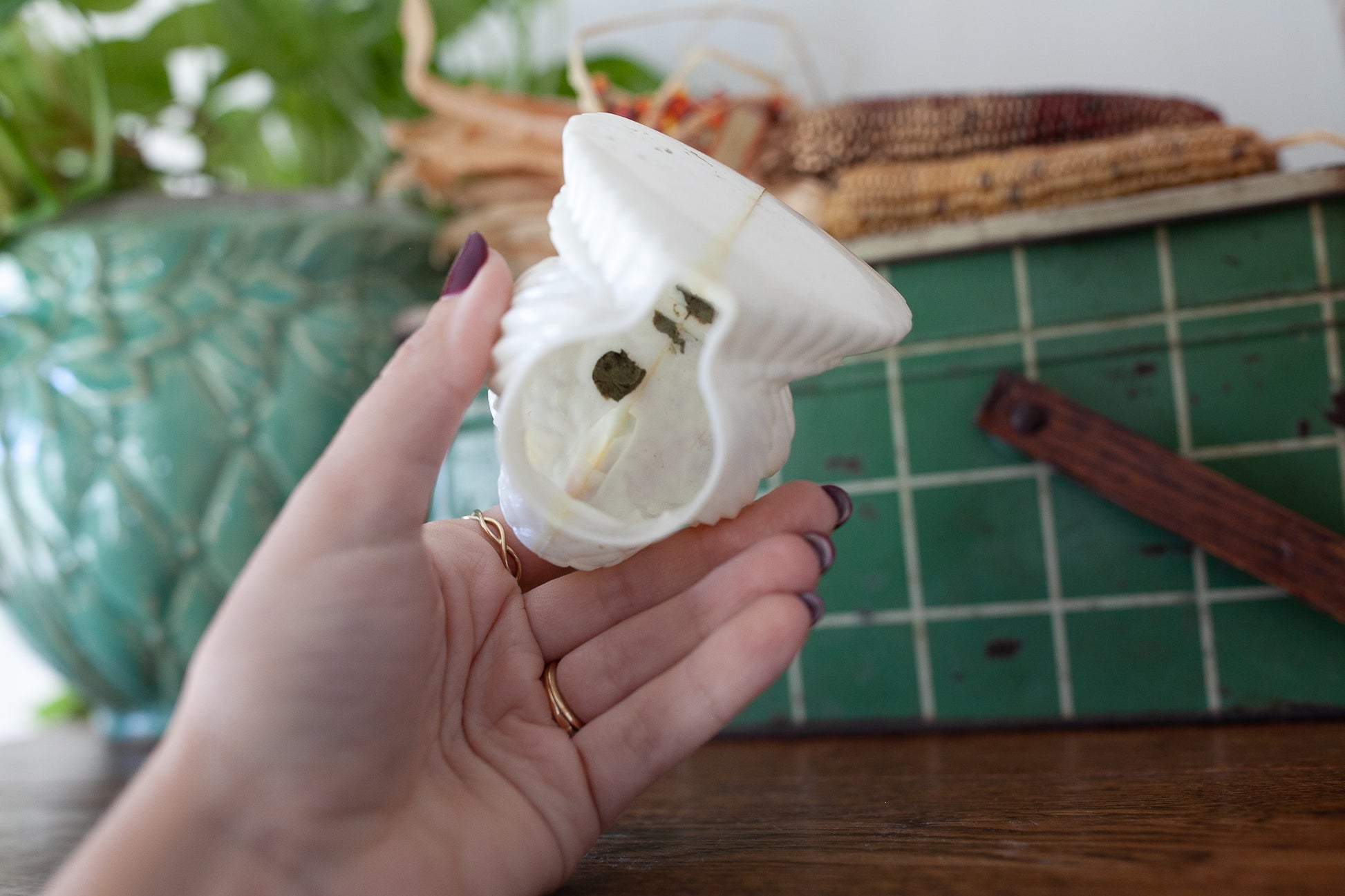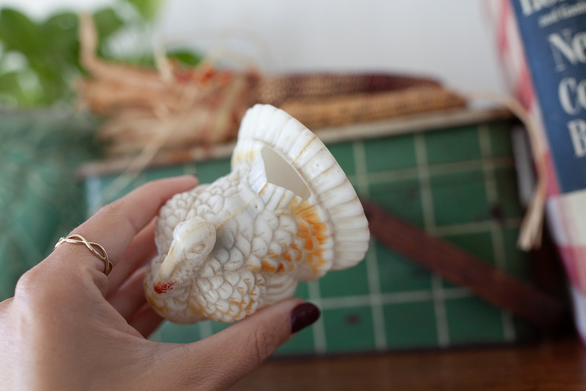 This guy is darling! He is a unique one in a white plastic material with little accents of brown and red. He has a opening in the back of his feathers you can put a little dried flower if you wanted to see photos. He is about 3.25" tall and wide. There is some aging of the glue that makes a yellow line on the back see photos- and there is some green foam inside the turkey from past use.