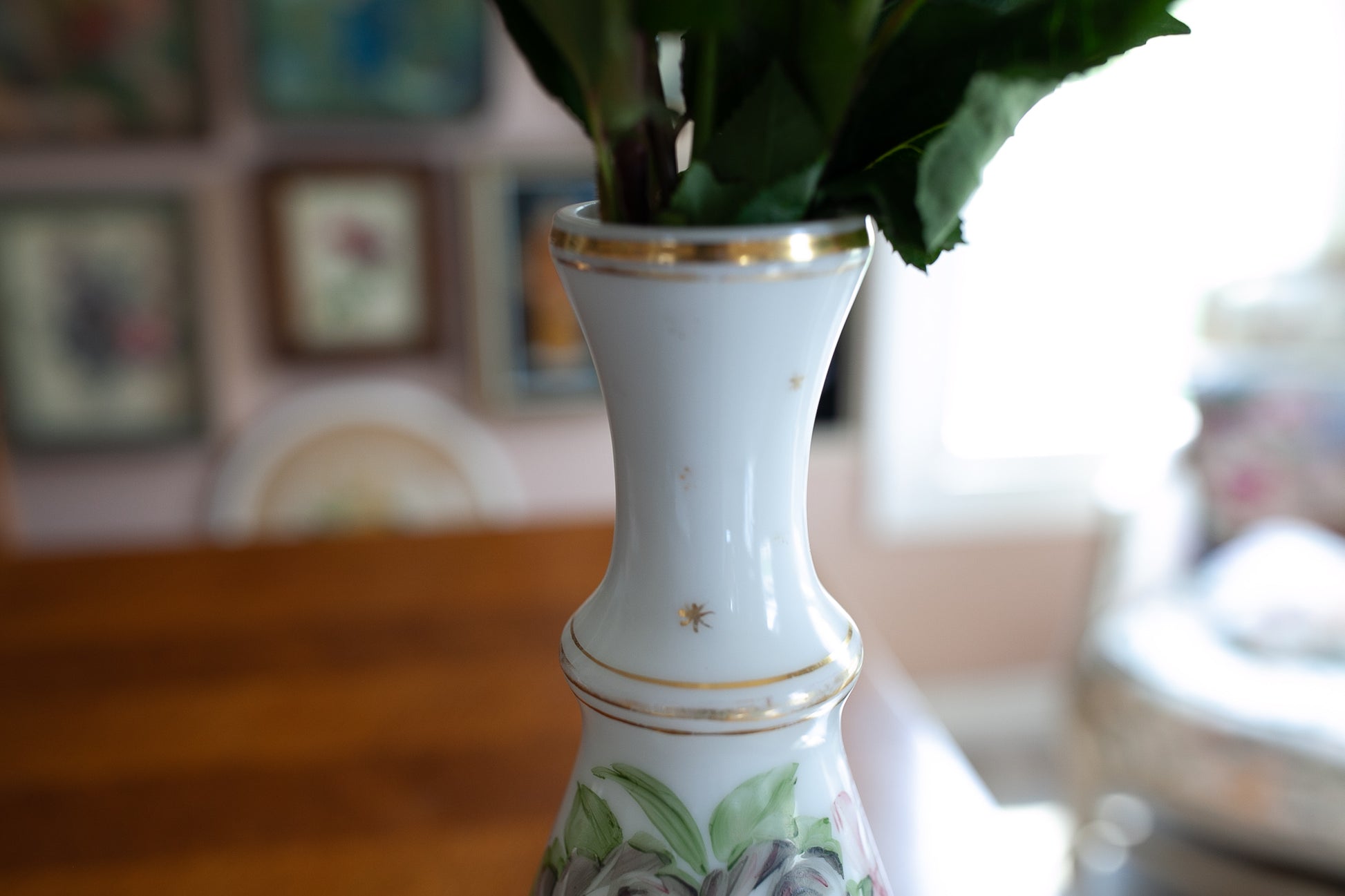This is a lovely floral vase. It is a white glass with painted florals and gold details. It is about 10.5" tall and about 2" wide diameter opening at the top. It is free of chips and cracks.