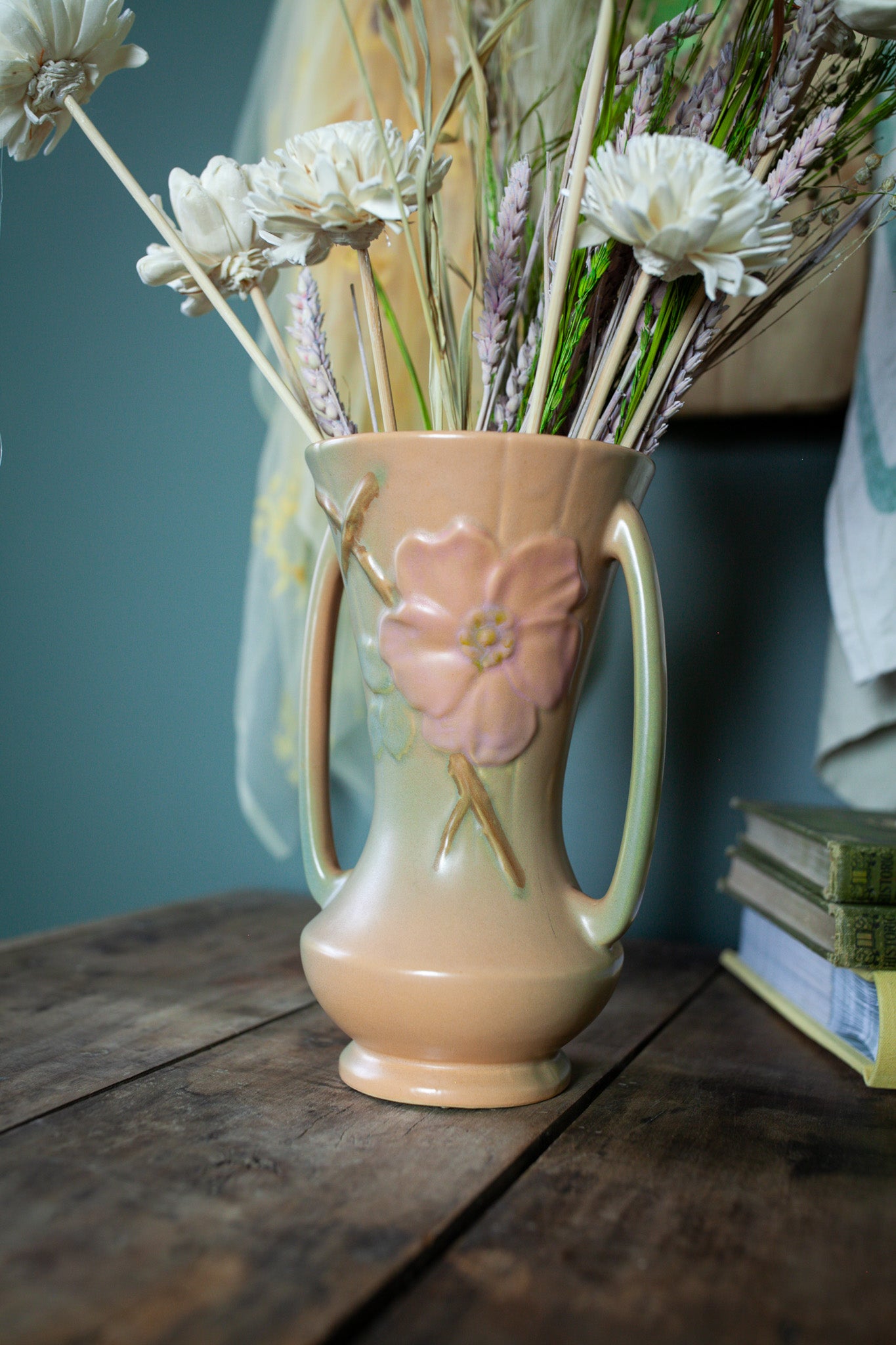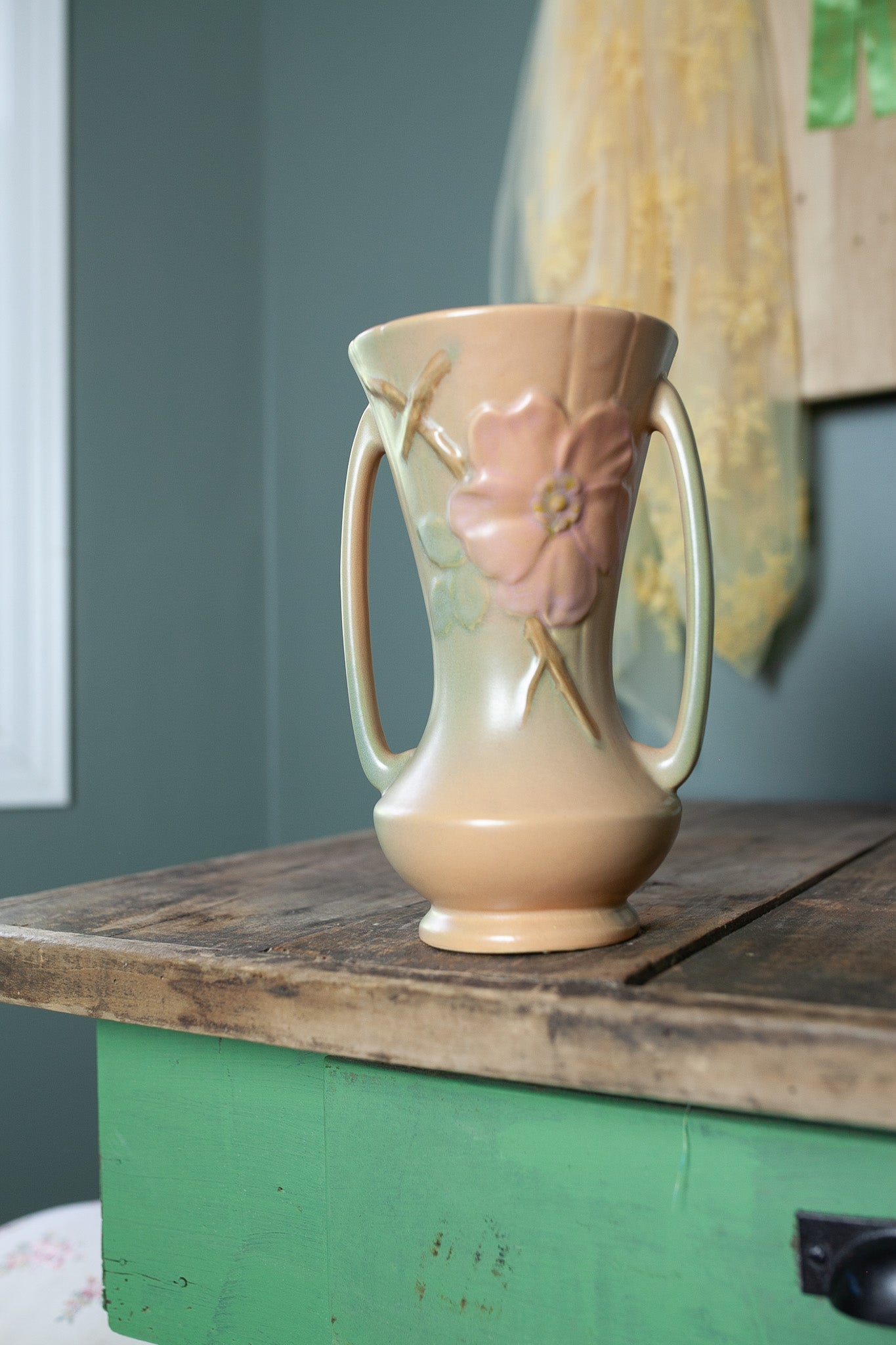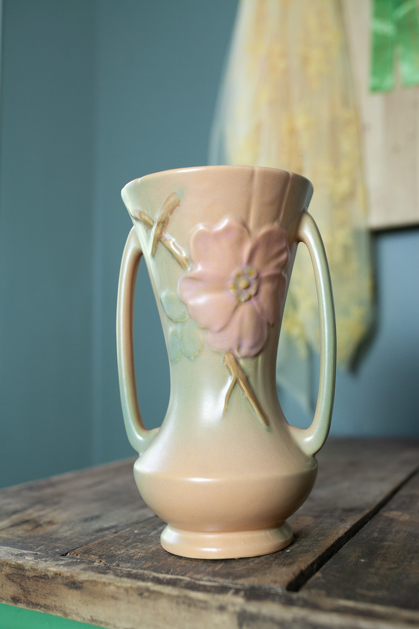 Vintage Weller Wild Rose Double Handled Vase 9.5 Inches Tall, 1930s Art Pottery