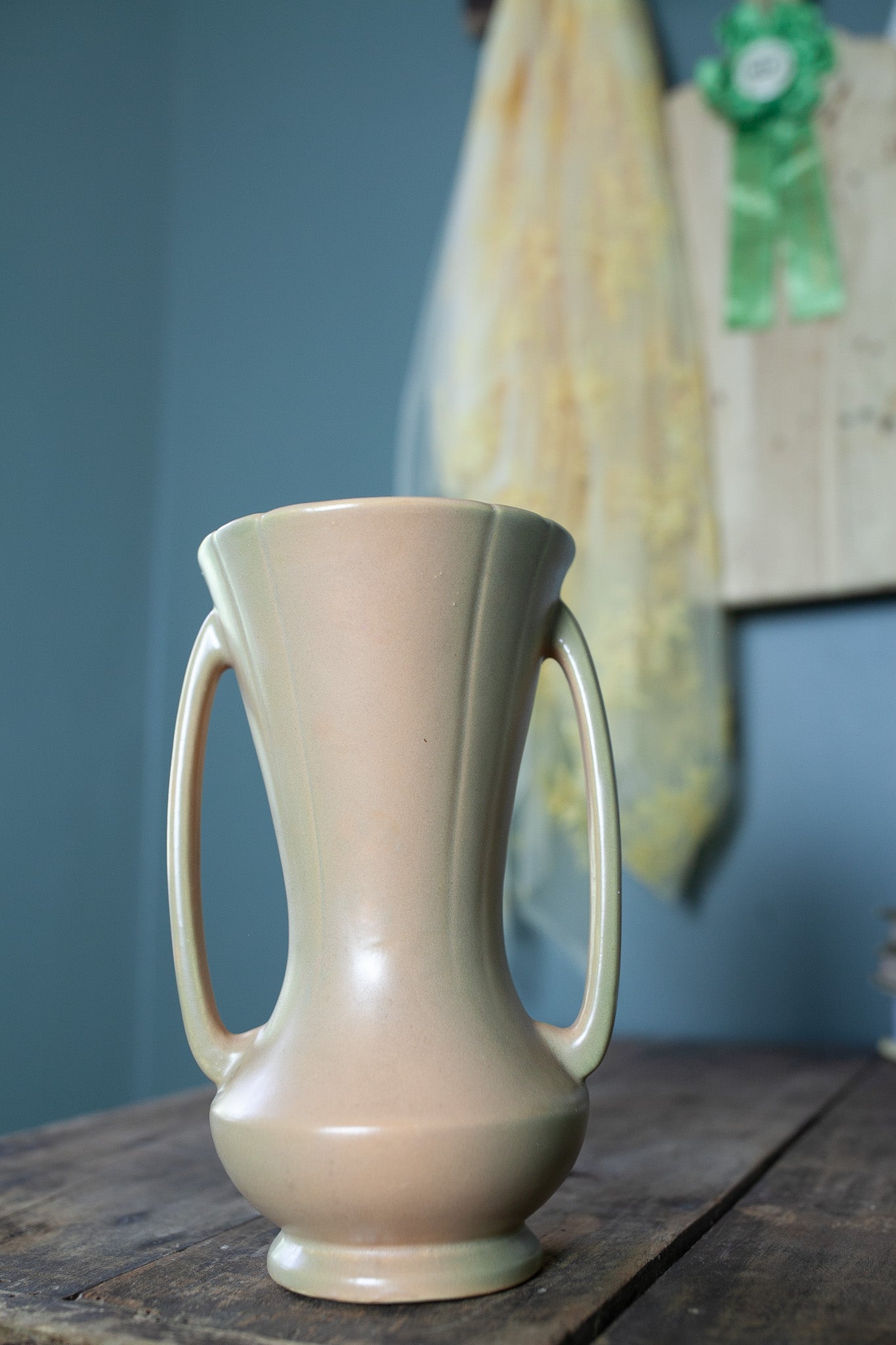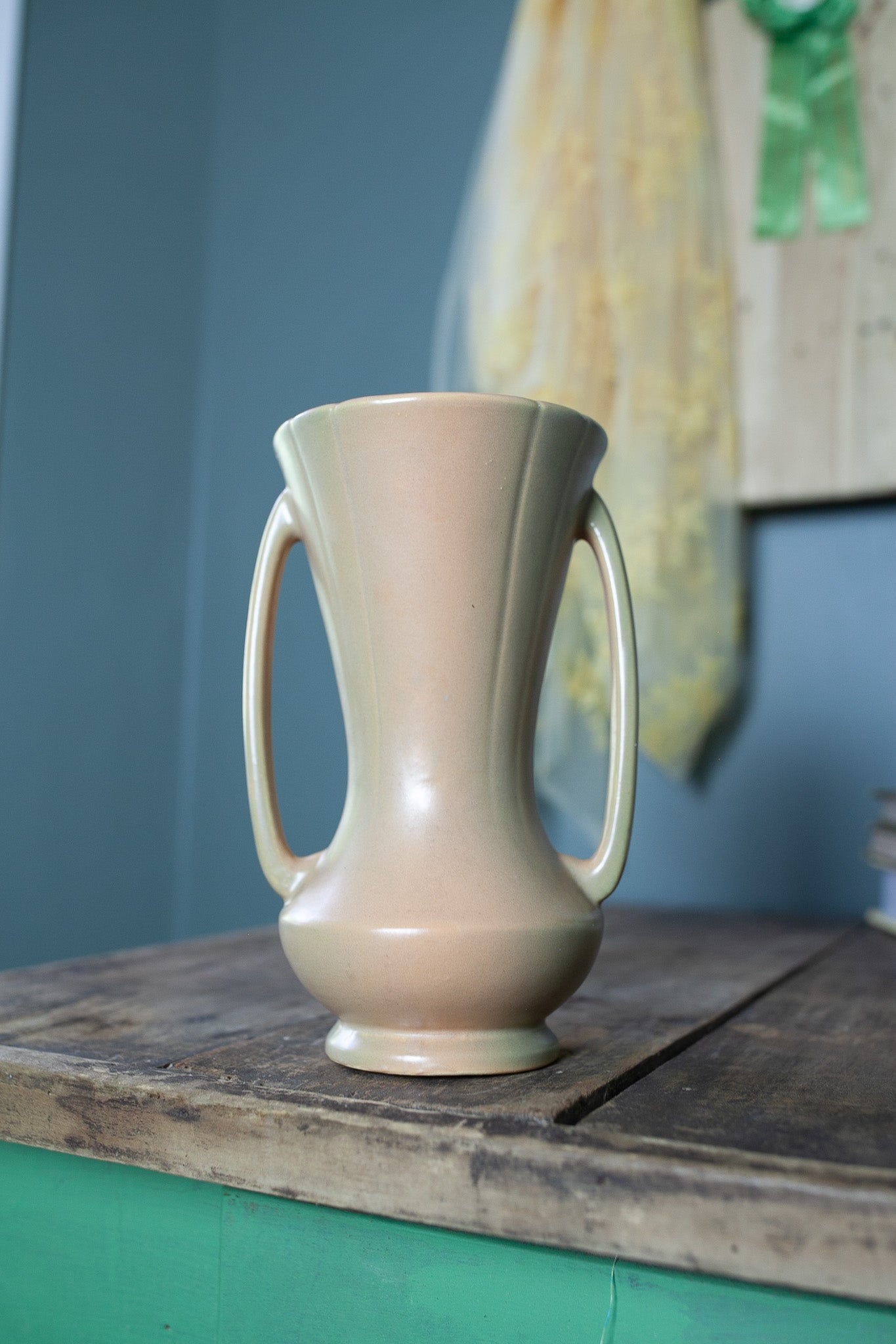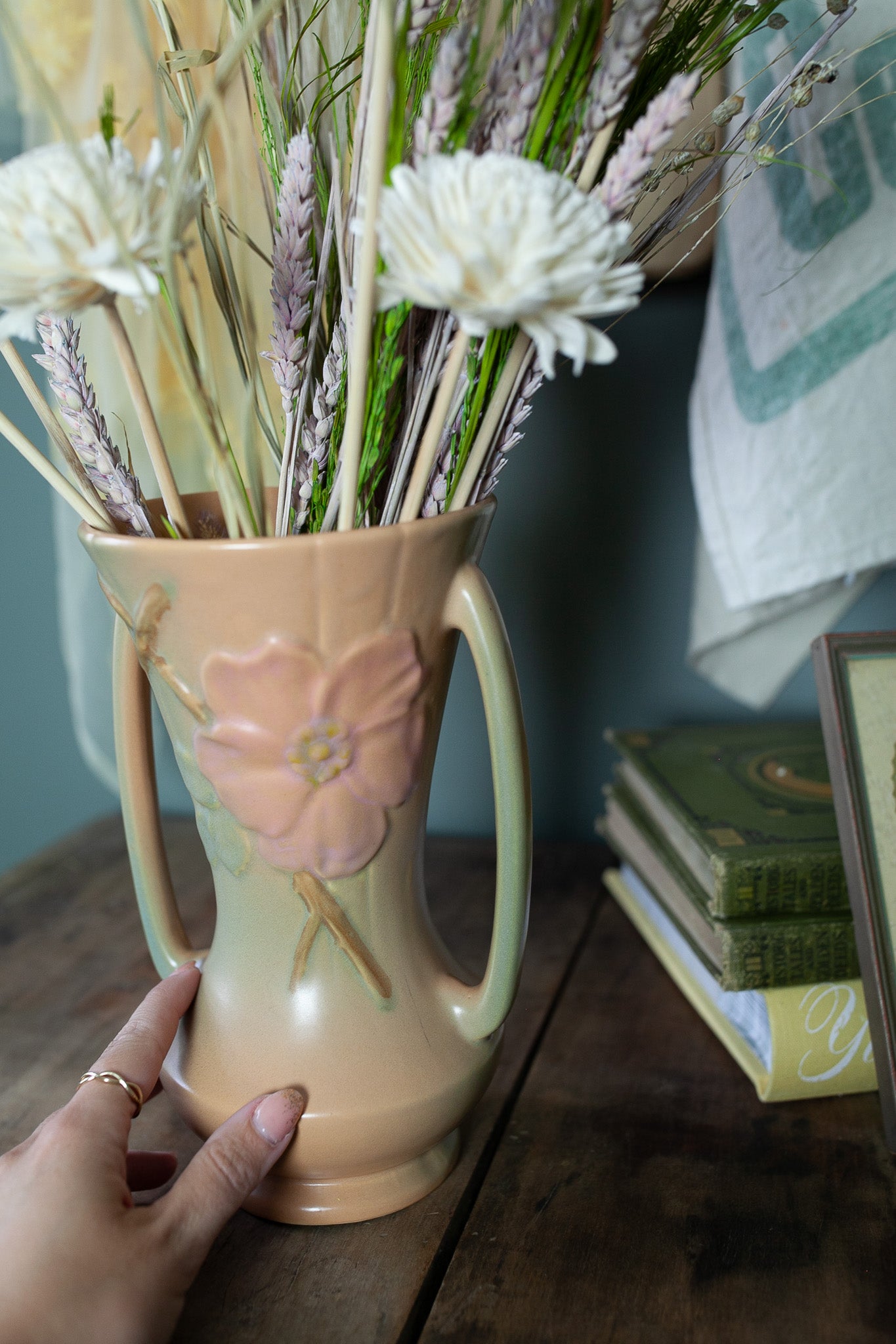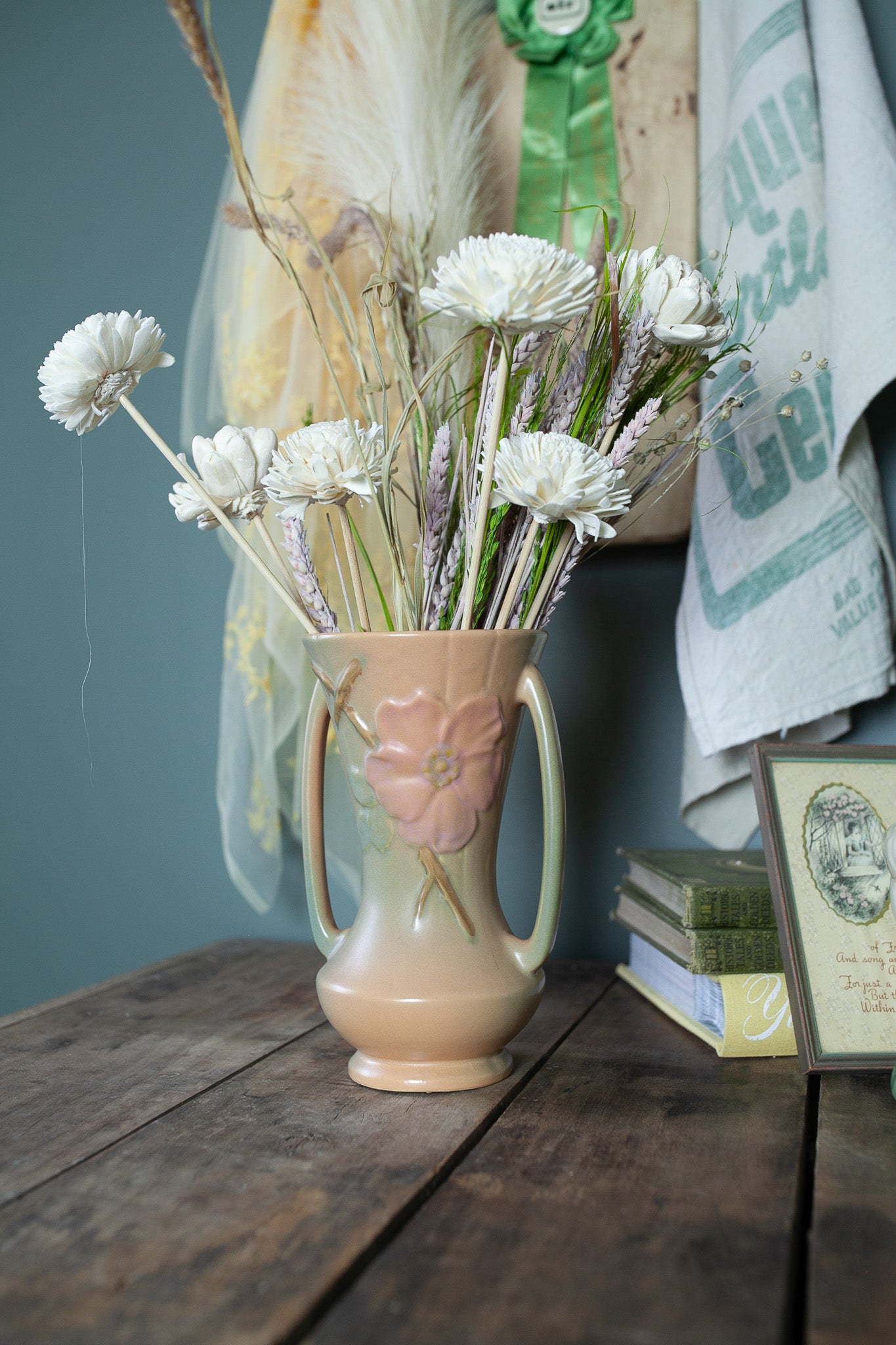 Vintage Weller Wild Rose Double Handled Vase 9.5 Inches Tall, 1930s Art Pottery