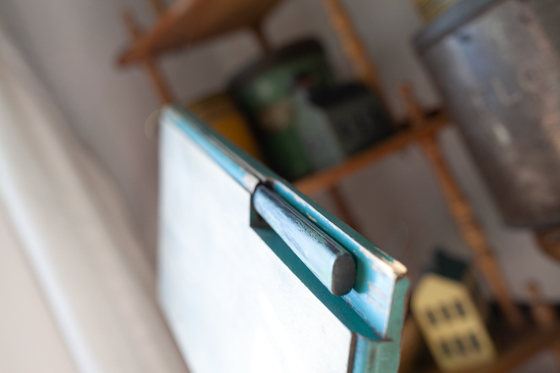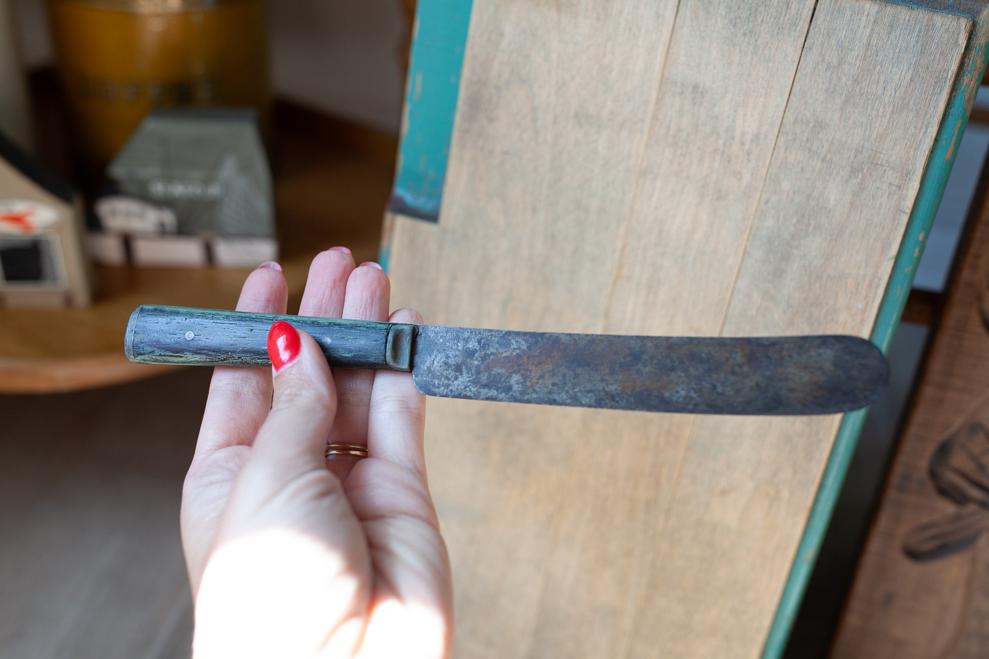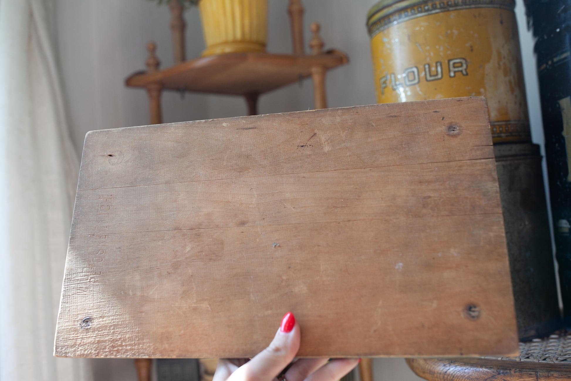 This wooden cutting board is a great vintage piece! I love the color of the wood and the green blue border! It is in good shape with just the obvious wear to the paint and lines from past use. The knife slides into a slot on the side. The board is about 14"x8" in size.